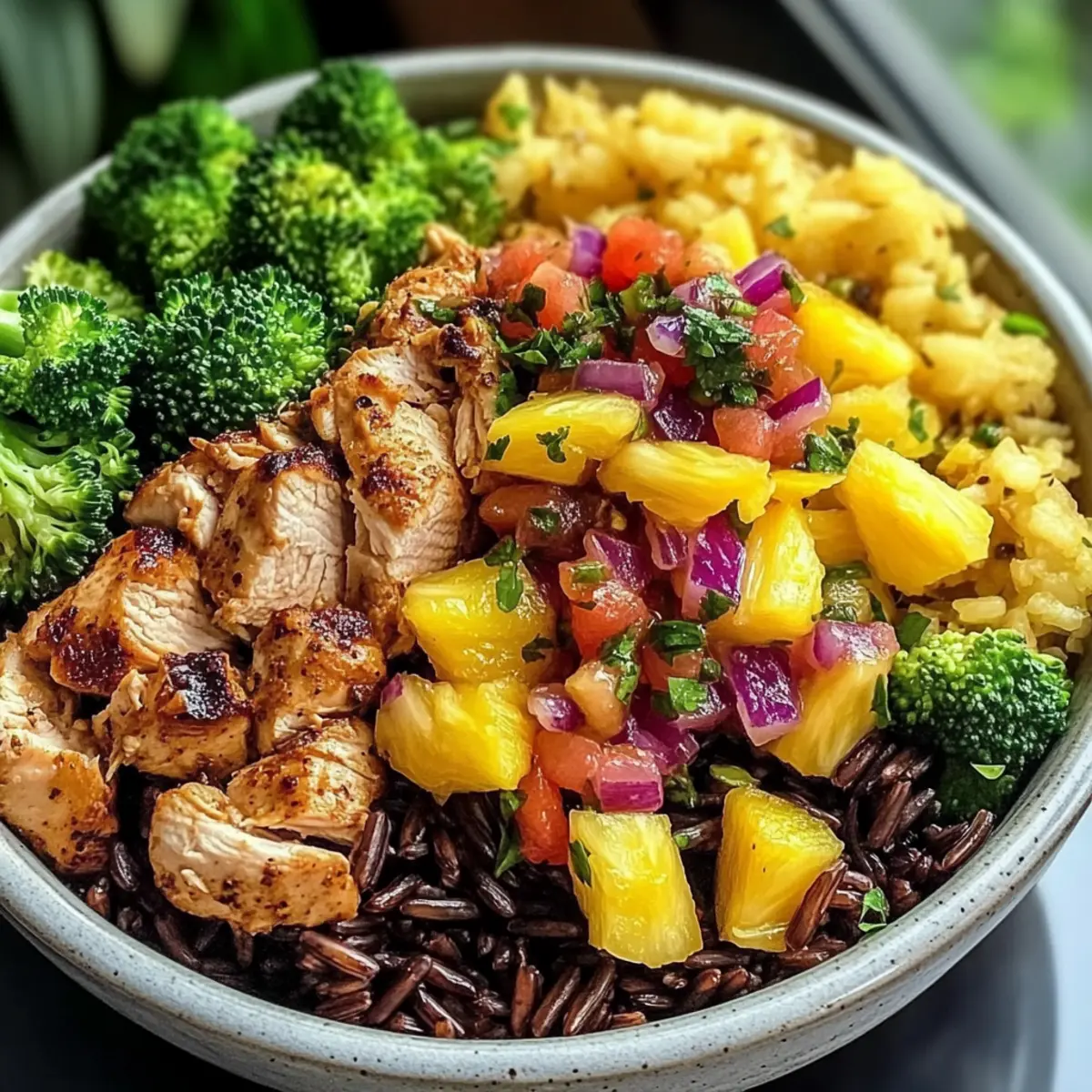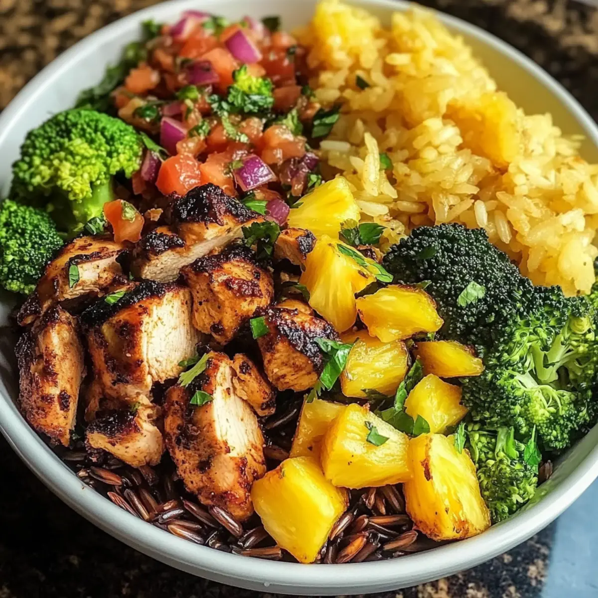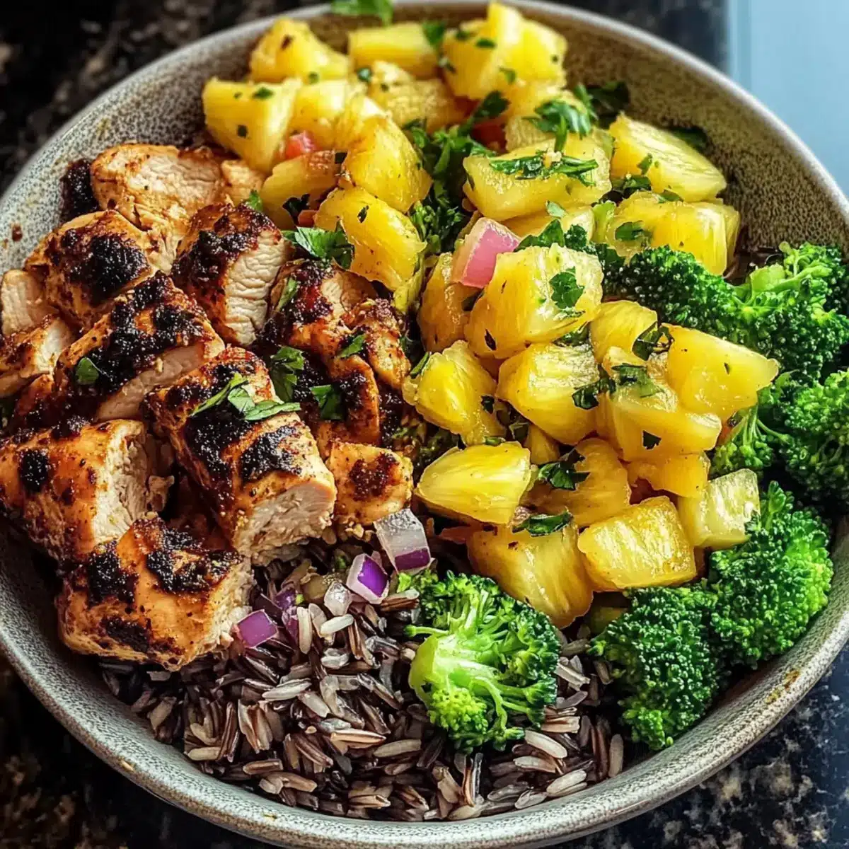 Nehme eine große Schüssel und beginne mit einer Schicht Wildreis als Basis. Füge dann die dampfenden Brokkoliröschen hinzu und lege die geschnittenen Jerk-Hähnchenscheiben darauf. Kröne die Bowl mit der frischen Ananassalsa und garniere sie nach Belieben mit frischem Koriander für zusätzlichen Geschmack. Serviere die Ananasschicken-Bowl warm und genieße die tropischen Aromen!