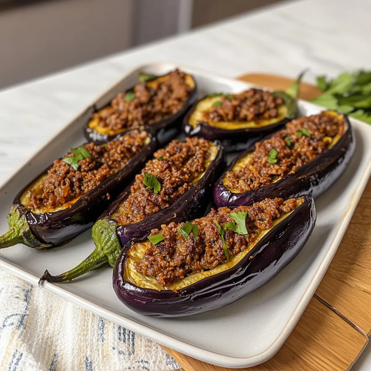 Lass die gefüllten Auberginen mit Hackfleischfüllung kurz ruhen, bevor du sie servierst. Sie passen prima zu beiligenden Knoblauchsoßen, frischem Joghurt oder einer Beilage aus Türkenreis. Genieße die Aromen und die zarte Textur dieses köstlichen Gerichts!