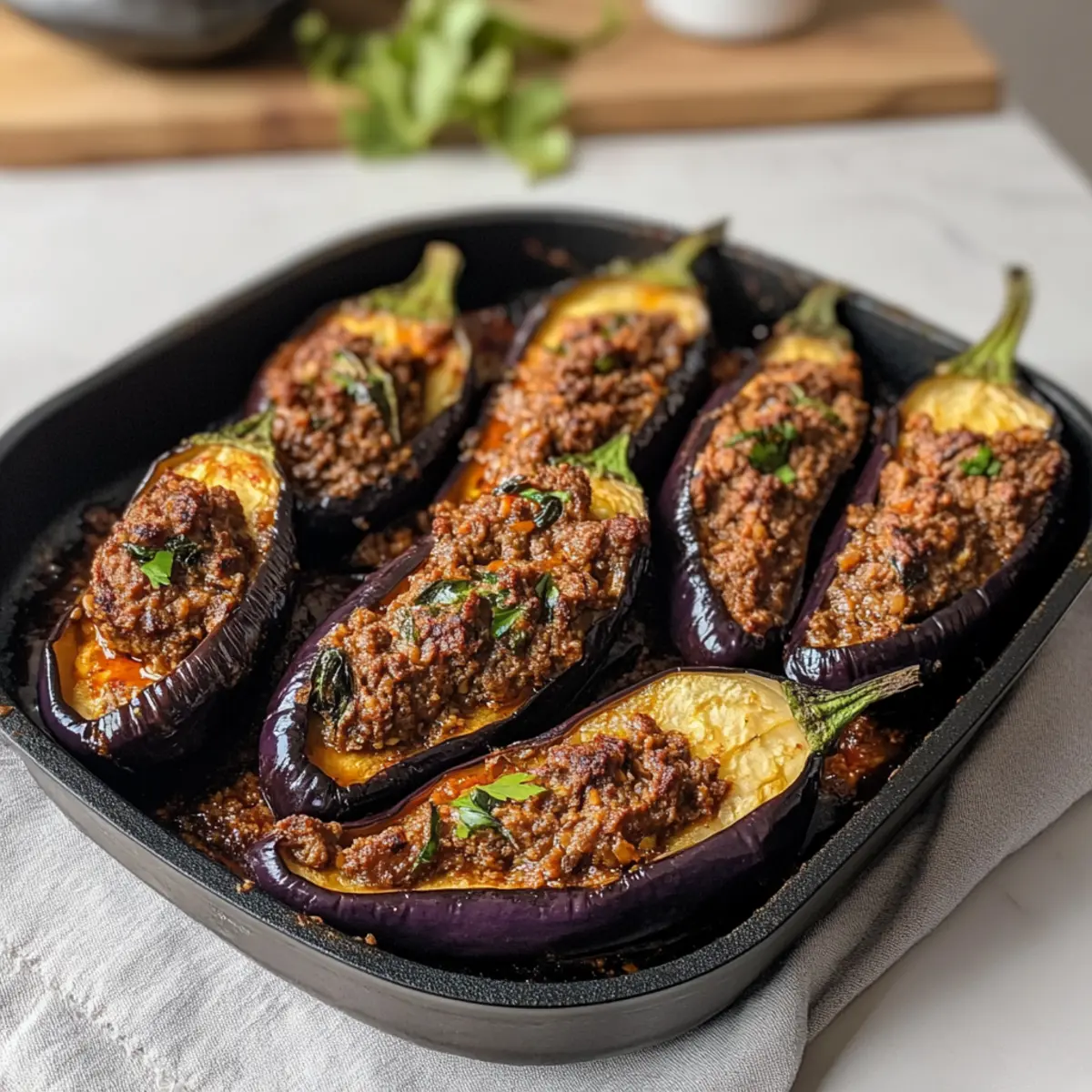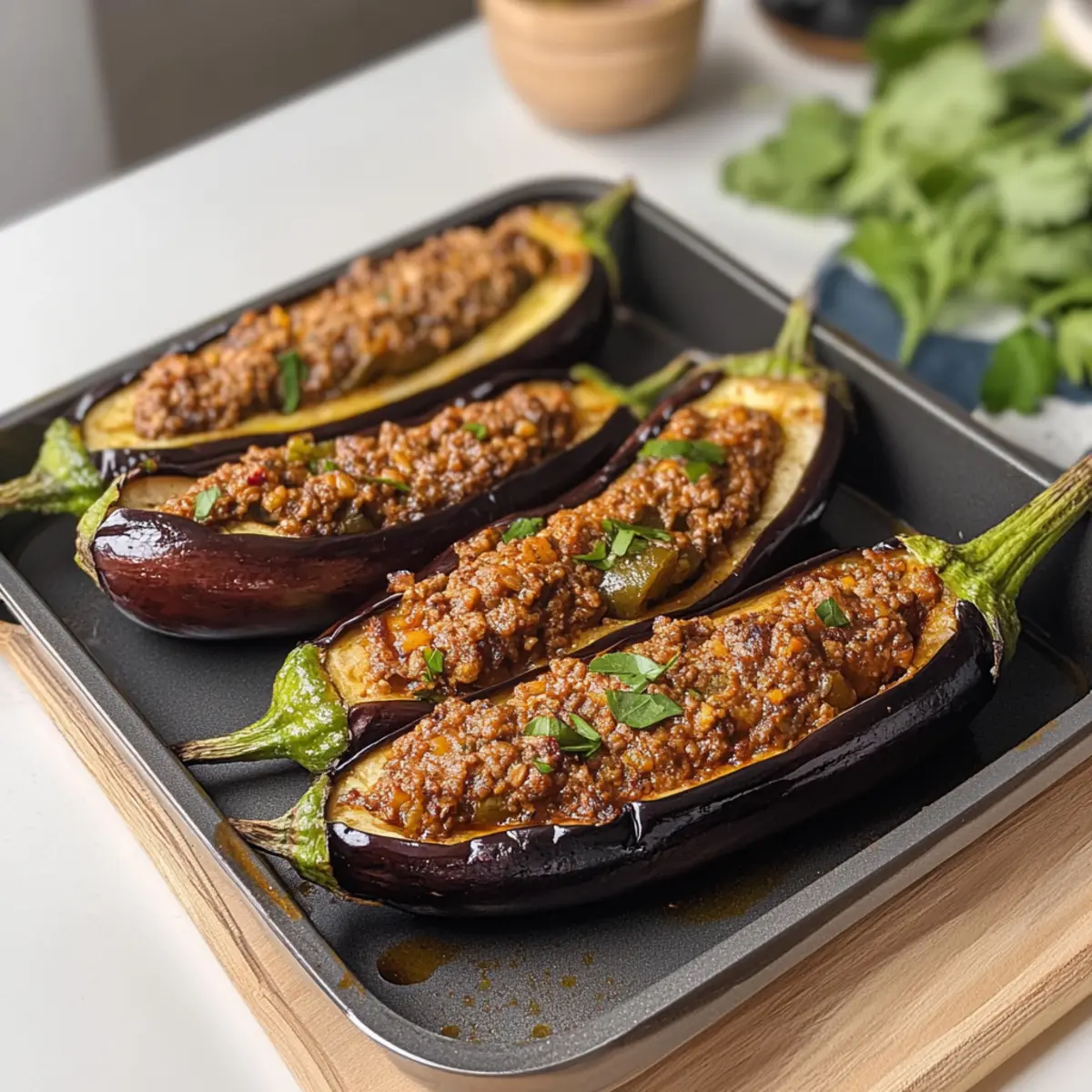 Frische Kräuter: Verwende frische Minze, wenn möglich, für ein intensiveres Aroma in deiner Aubergine mit Hackfleischfüllung.