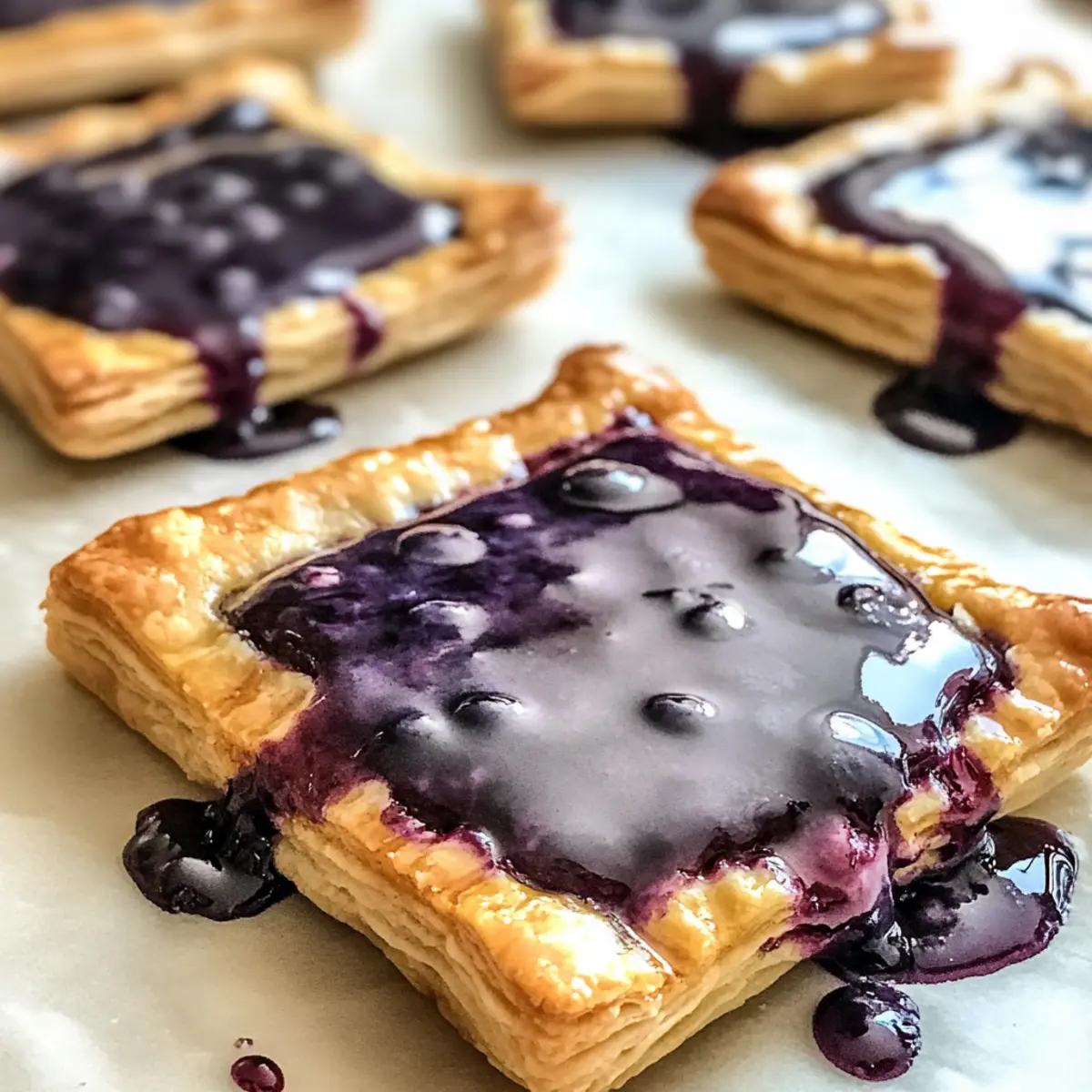 - Platziere jeweils einen Teigrechteck auf ein Backblech mit Backpapier. Gib einen Löffel der Blaubeerfüllung in die Mitte jedes Rechtecks. Bedecke die Füllung mit einem weiteren Teigrechteck und drücke die Ränder fest.
