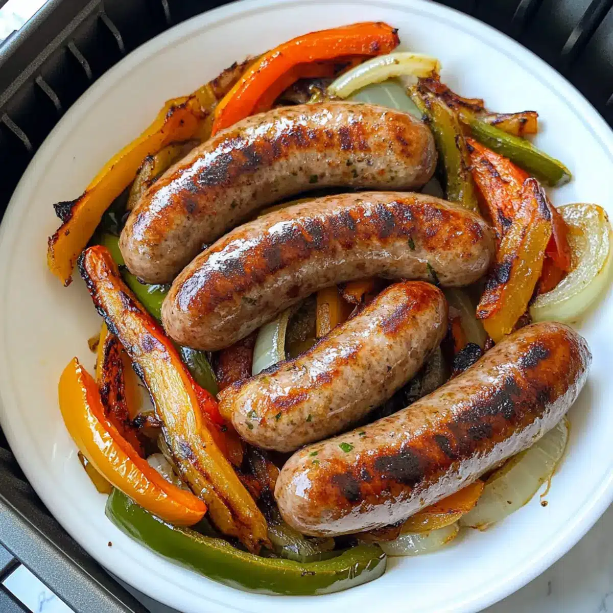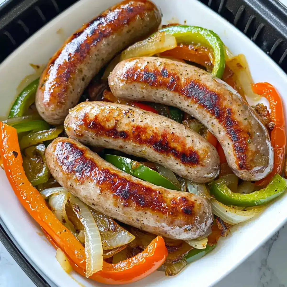 Bratwürste im Heißluftfryer mit Paprika und Zwiebeln