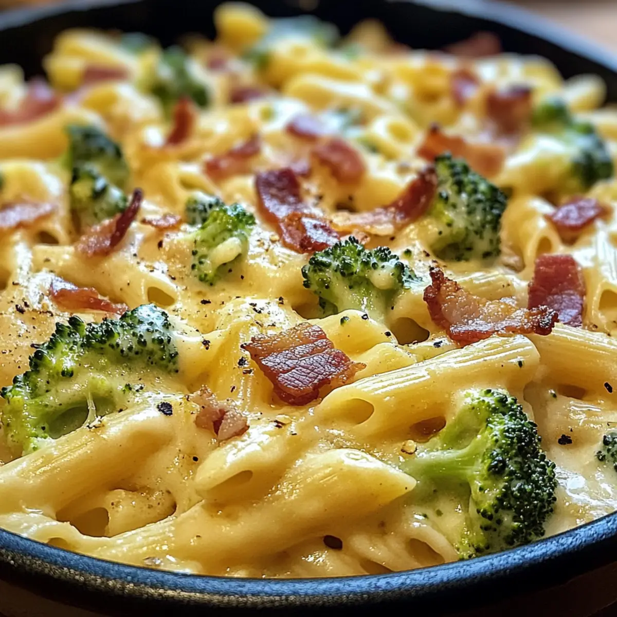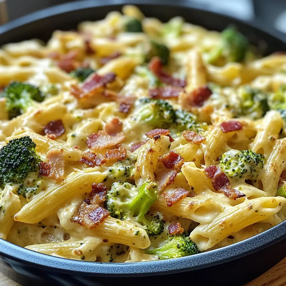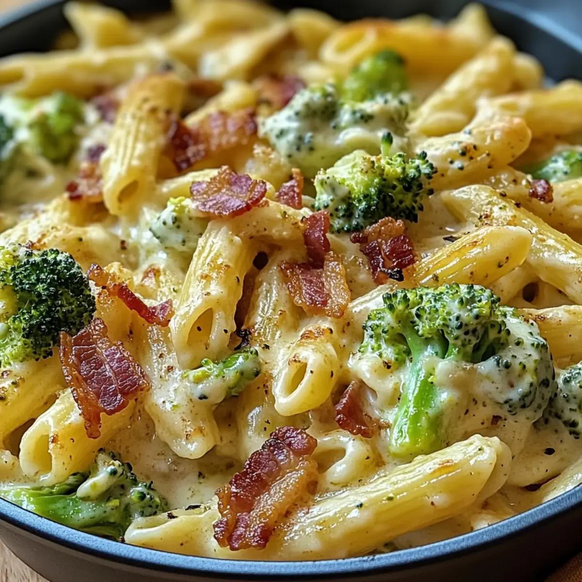 Köstliche Kombination: Diese cremige Pastapfanne kombiniert perfekt den herzhaften Geschmack von knusprigem Bacon mit dem frischen Brokkoli – ein Traum für alle, die es sich gut gehen lassen möchten.