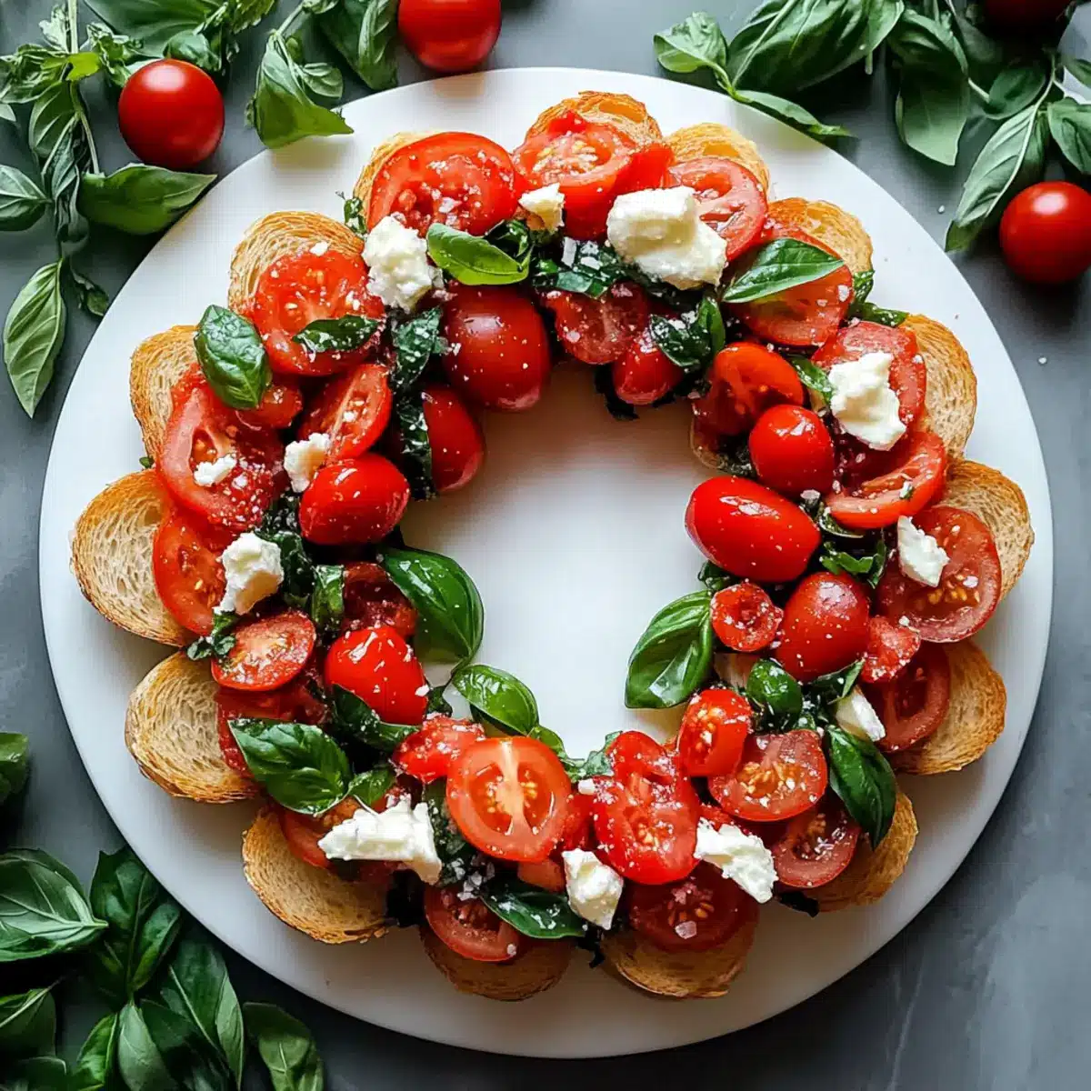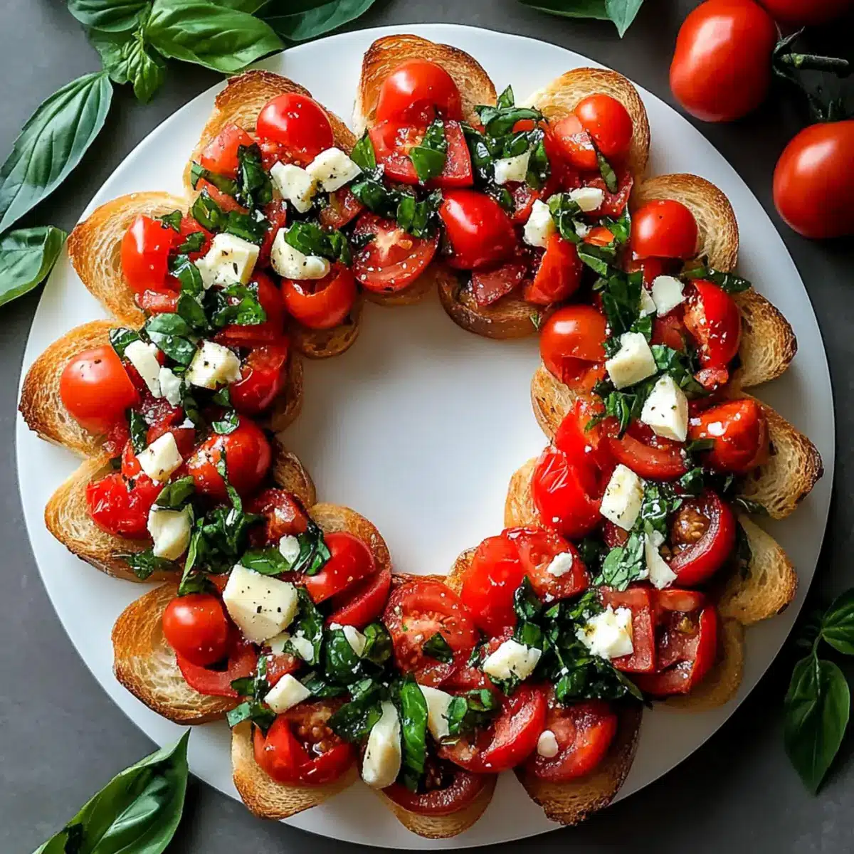 Arrangiert die gerösteten Baguettescheiben in einem Kreis auf einem Servierteller, um den festlichen Look eines Bruschetta Kranzes zu erzielen. Gebt mit einem Löffel die Tomaten- und Käsemischung auf jede Scheibe. Diese Anordnung sorgt nicht nur für einen schönen Anblick, sondern auch für eine einladende Präsentation.