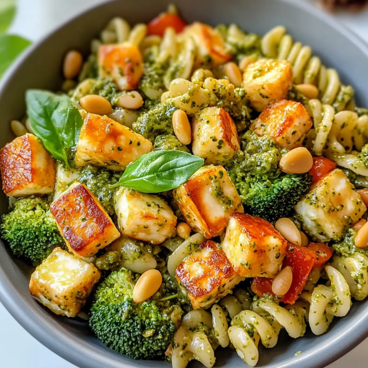 Vielfältige Aromen: Der salzige Halloumi harmoniert perfekt mit dem frischen Gemüse und dem aromatischen Pesto, was jedem Biss eine aufregende Geschmacksexplosion verleiht.