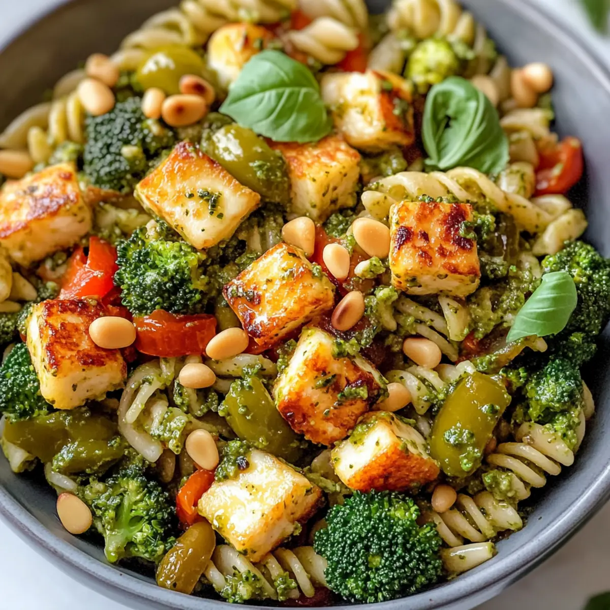 Servieren Sie den Salat in Tellern oder einer großen Schüssel. Legen Sie die knusprigen Halloumi-Scheiben darauf, streuen Sie die gerösteten Pinienkerne darüber und garnieren Sie mit frischen, fein geschnittenen Frühlingszwiebeln sowie optional mit Basilikumblättern. Genießen Sie diesen köstlichen bunten Halloumi-Pastasalat sofort!