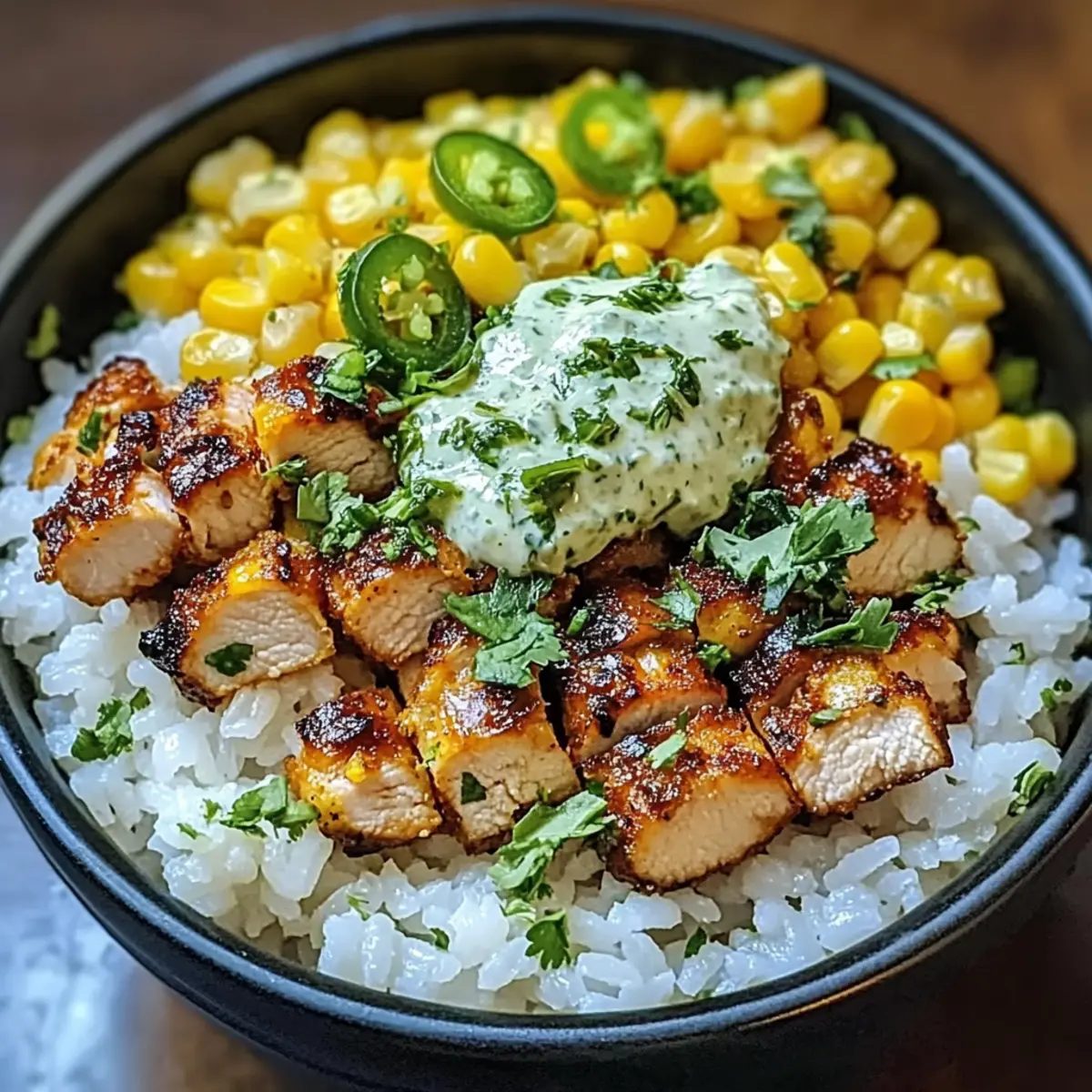 Hähnchen Reis Schüssel mit gegrilltem Mais