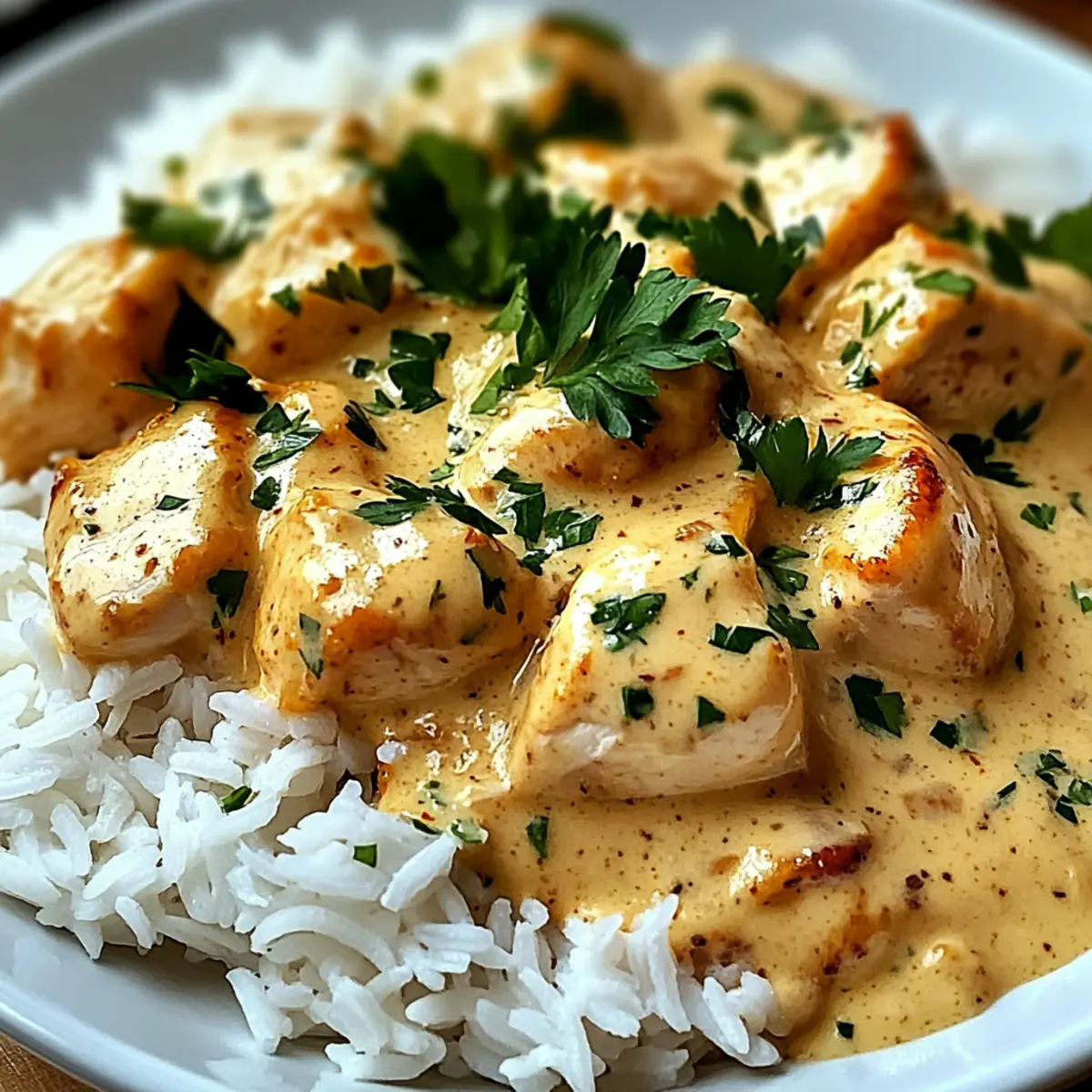 - Serviere dein ultimatives cremiges Hähnchen auf Tellern und garniere es mit frisch gehackter Petersilie.