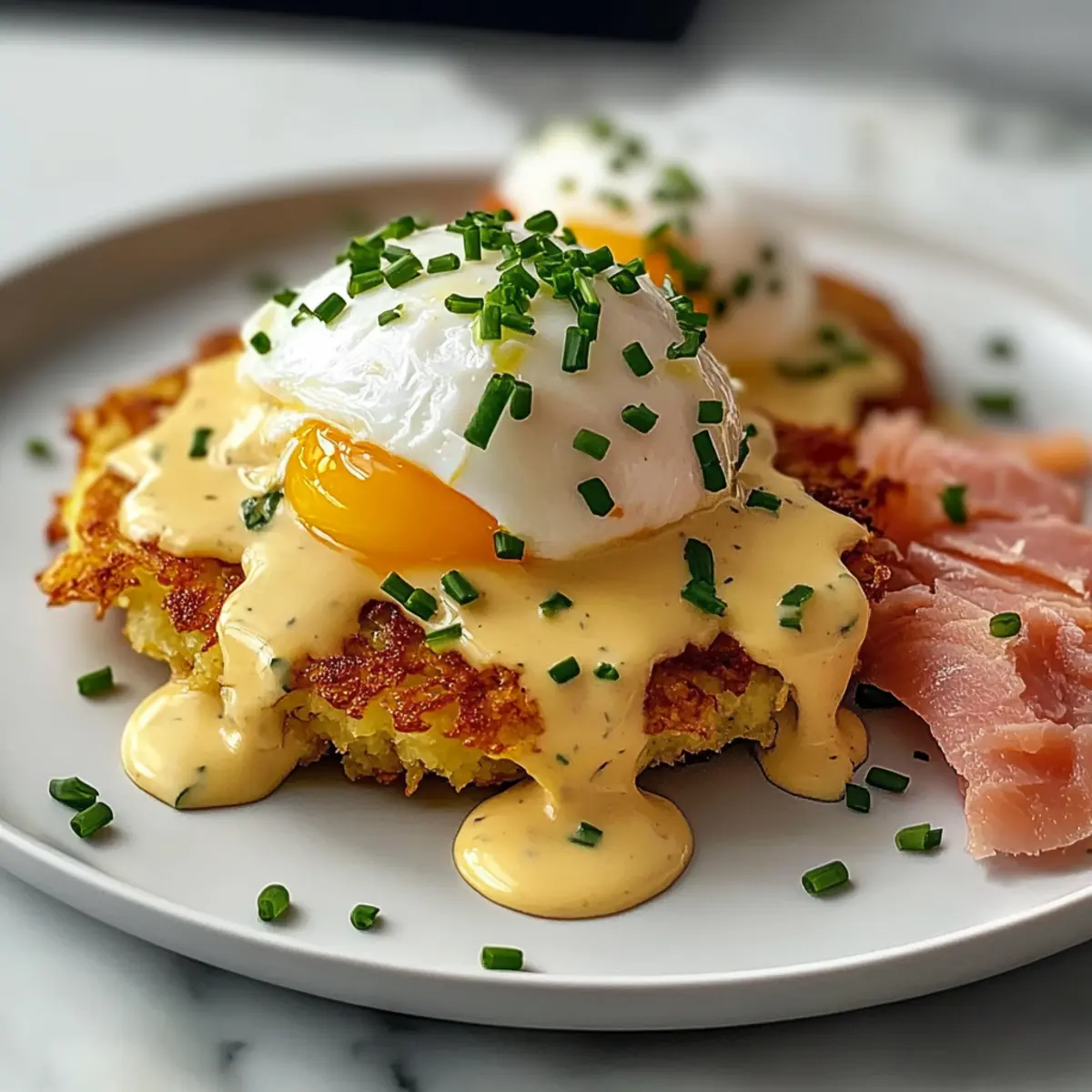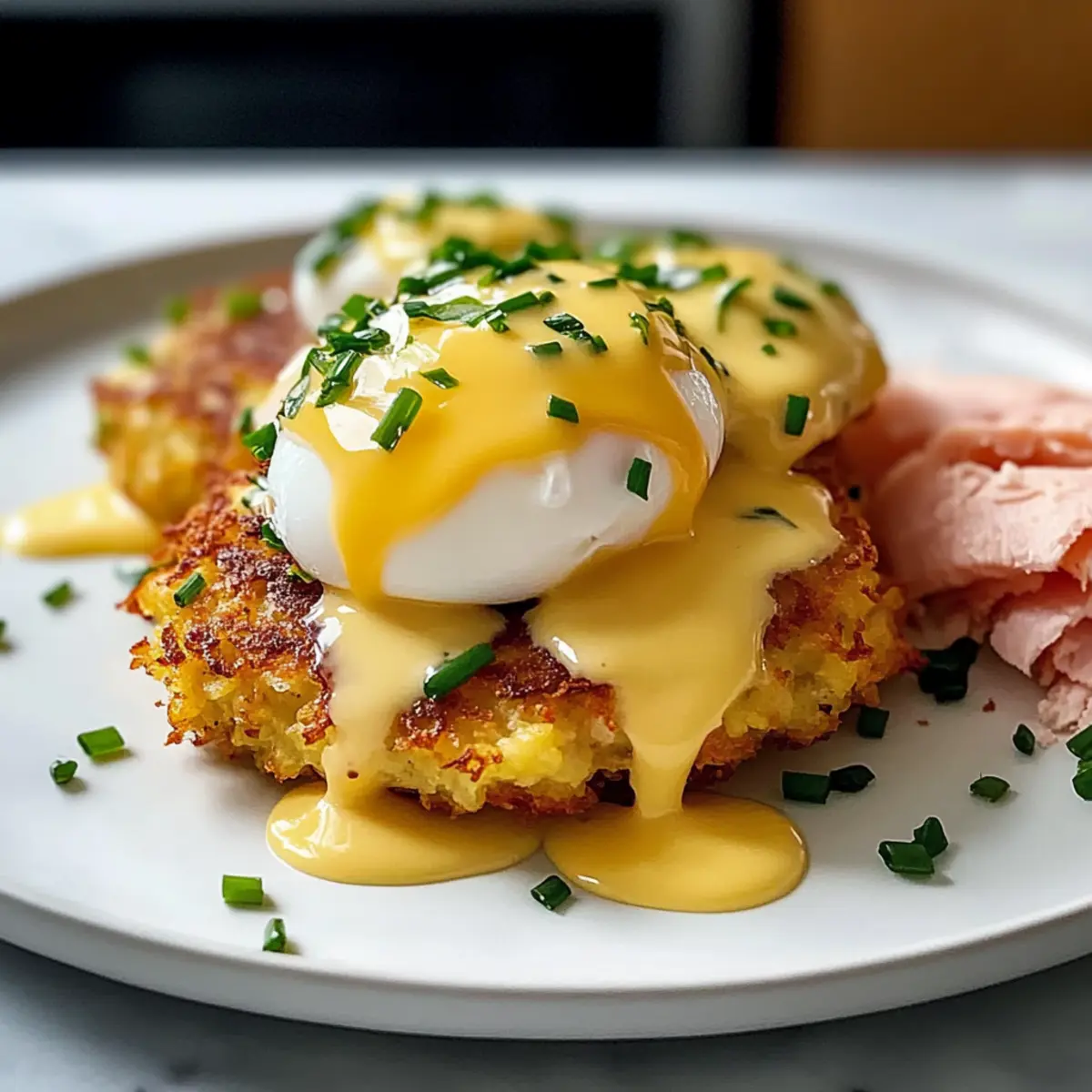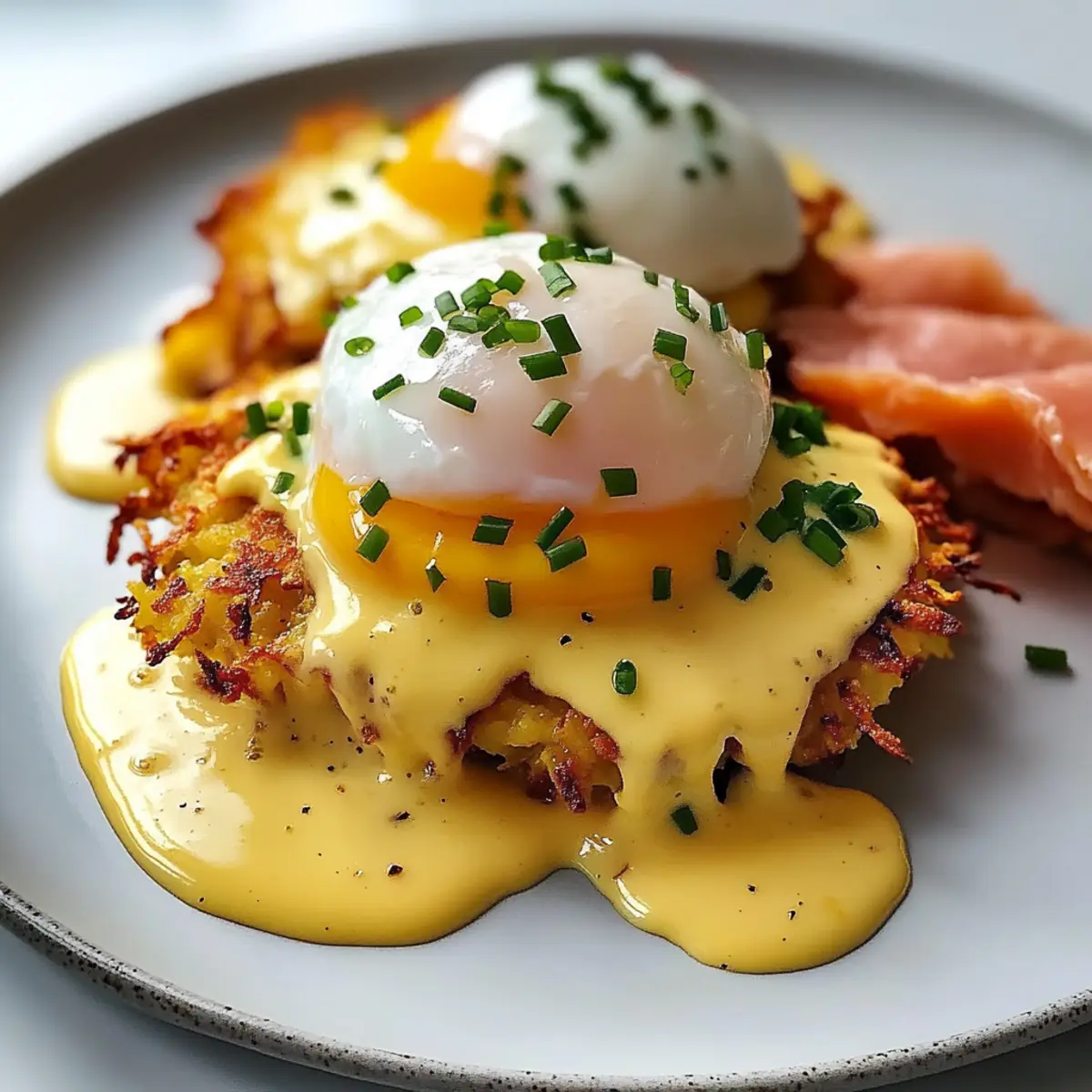Perfekte Textur: Die knackigen Latkes versprechen einen köstlichen Kontrast zur cremigen Hollandaise, welches jedem Bissen eine aufregende Dimension verleiht.