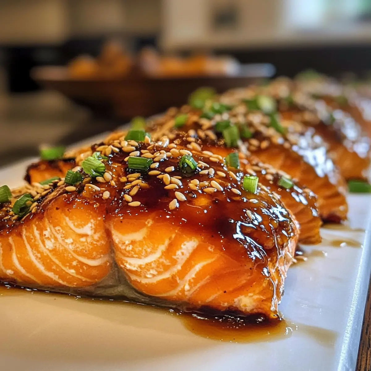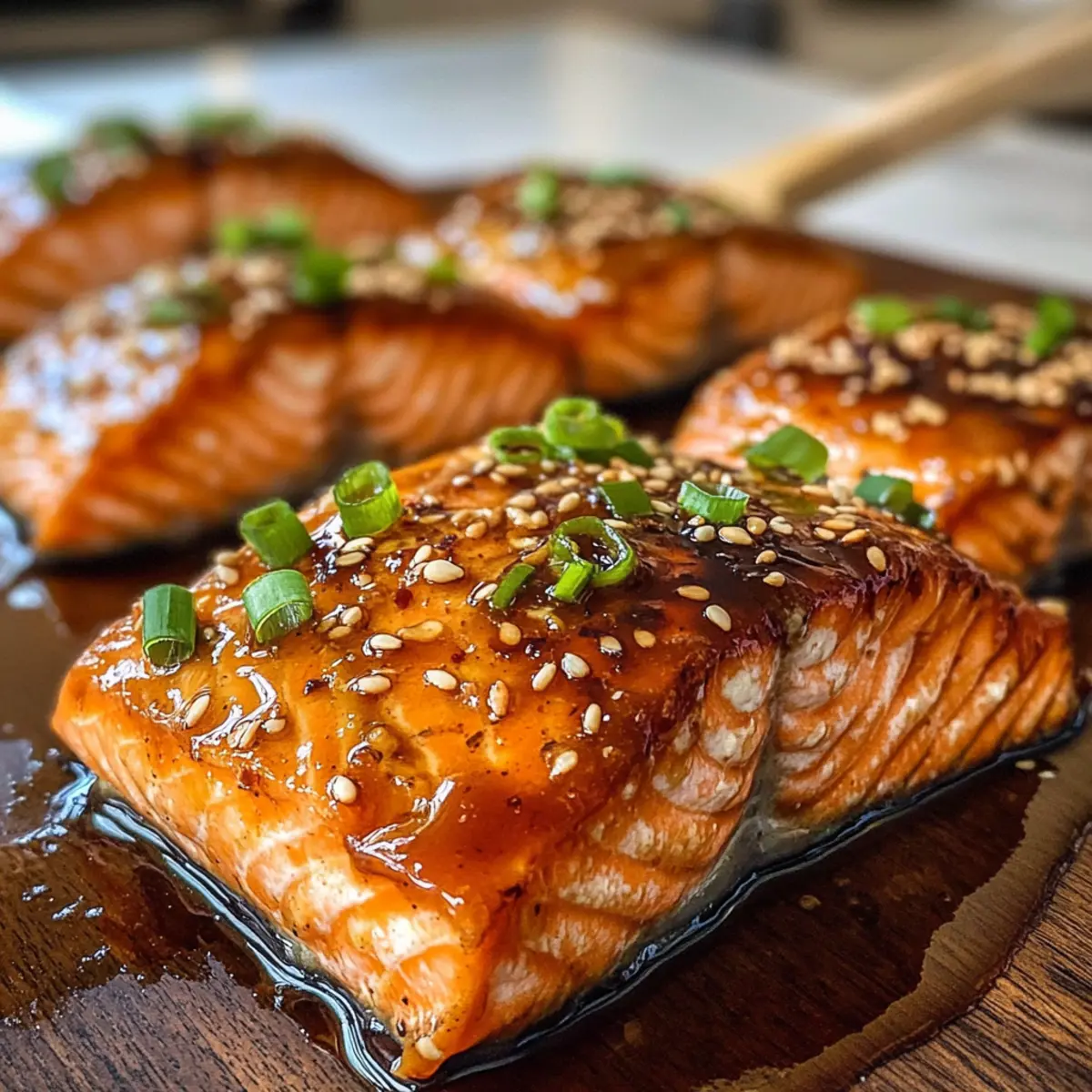 - Nach dem Backen den Lachs erneut mit der restlichen Glasur bestreichen und garnieren.