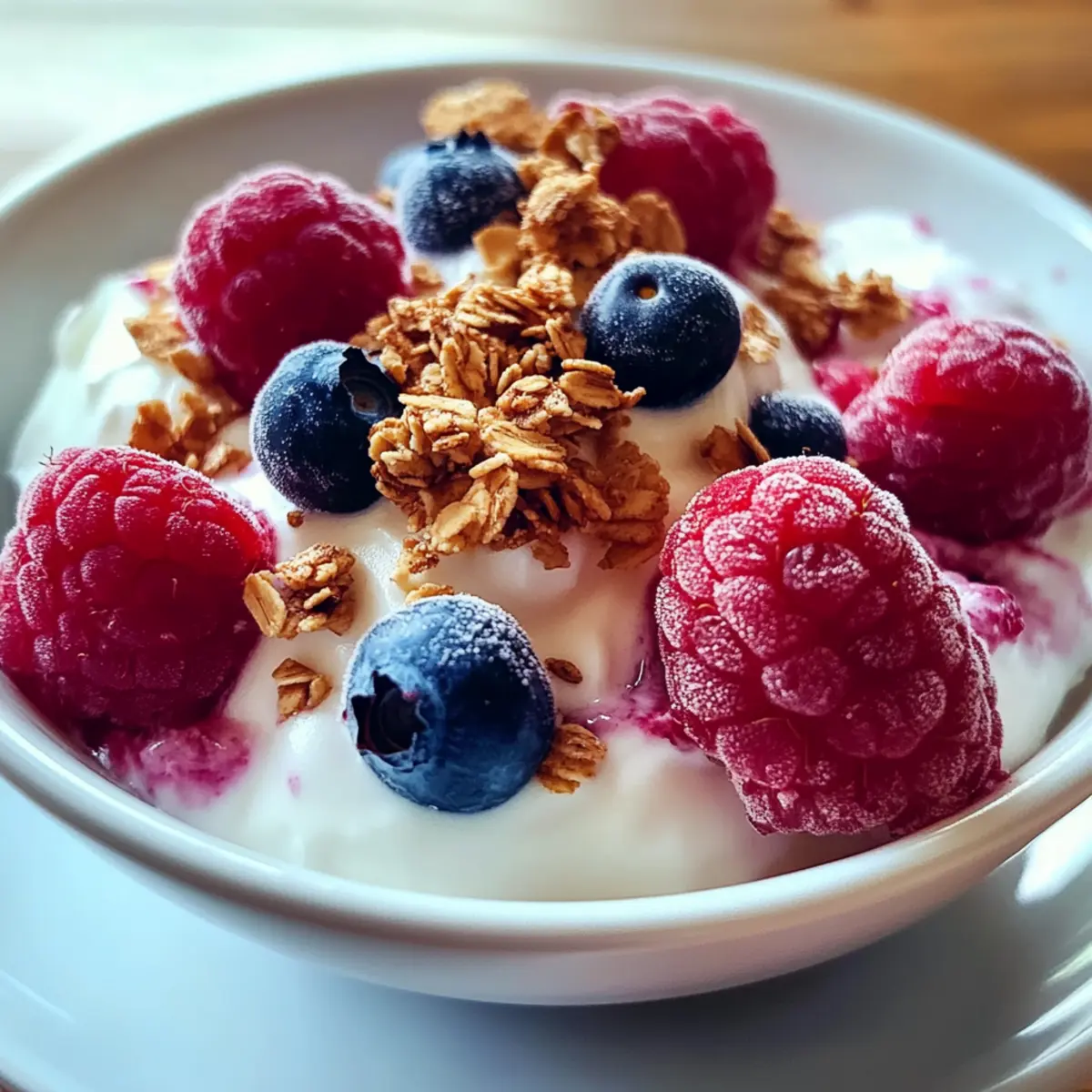 - Füge vorsichtig die Himbeeren und Heidelbeeren zur Joghurtmischung hinzu und hebe sie sanft unter.