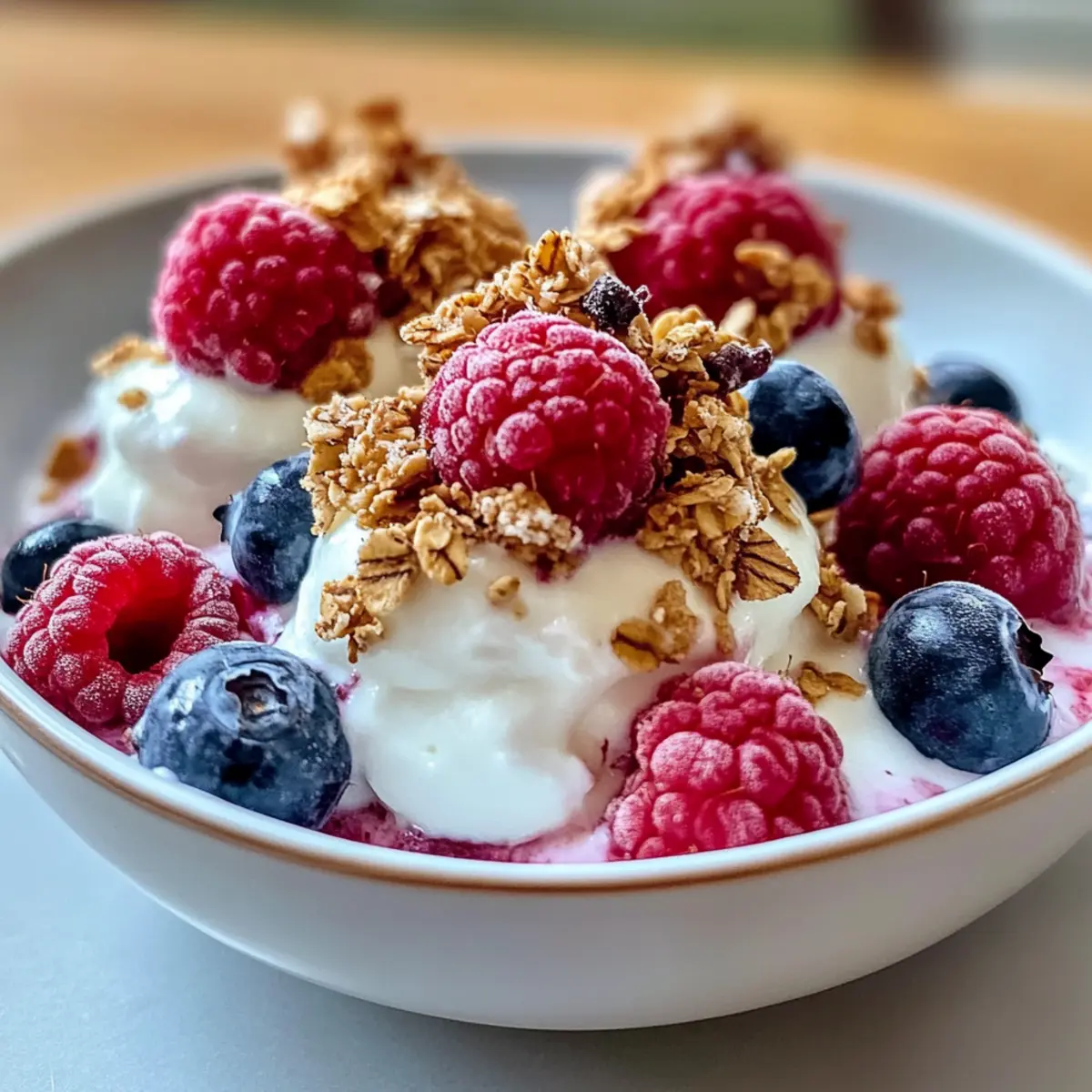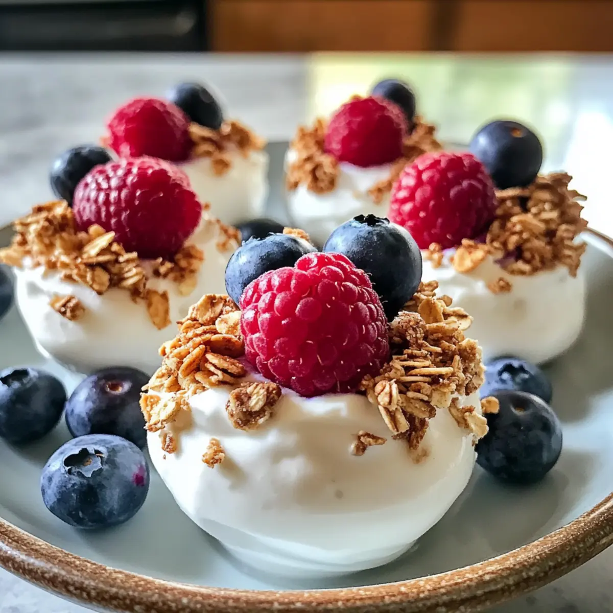Frische Beeren: Die Kombination aus Himbeeren und Heidelbeeren bringt eine fruchtige Note und harmoniert perfekt mit der Cremigkeit der Joghurtbissen. Sie bringen einen Hauch von Sommer auf den Teller!