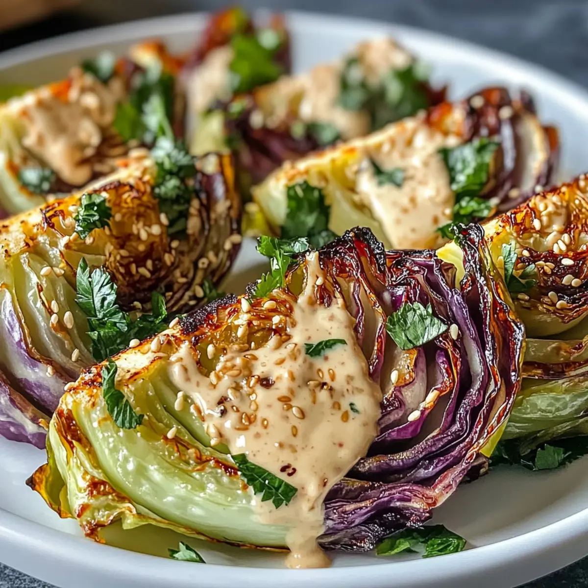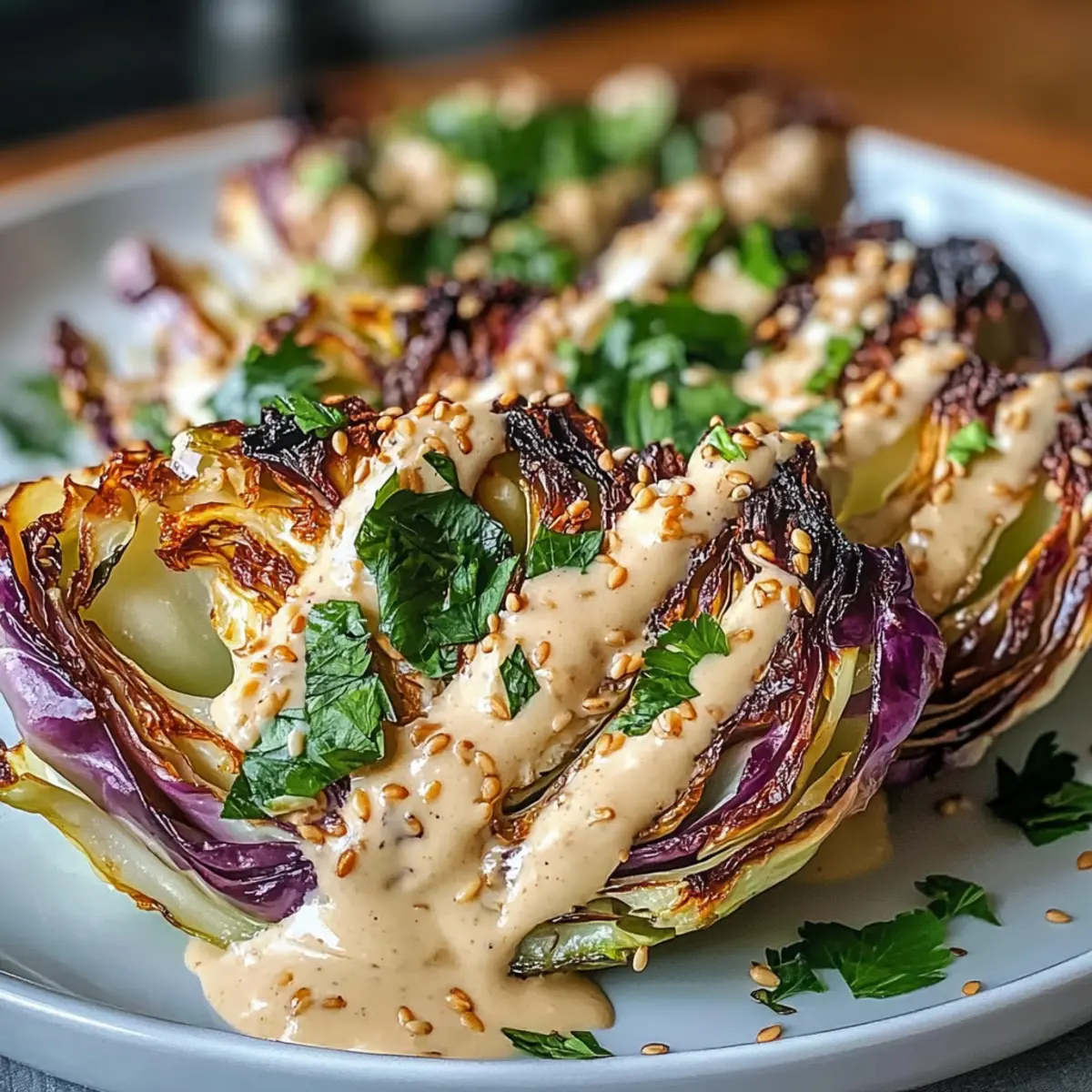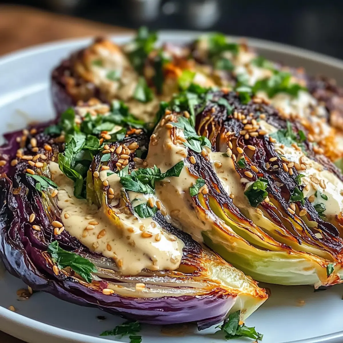 Sobald der Kohl fertig geröstet ist, nehmen Sie das Backblech aus dem Ofen und lassen Sie die Spalten kurz abkühlen. Übertragen Sie die Kohlspalten auf einen Servierteller und träufeln Sie großzügig die vorbereitete Tahini-Sauce darüber. Garnieren Sie das Gericht mit 1 Esslöffel gerösteten Sesamsamen, frischen Kräutern und einer Prise Räucherpaprika.