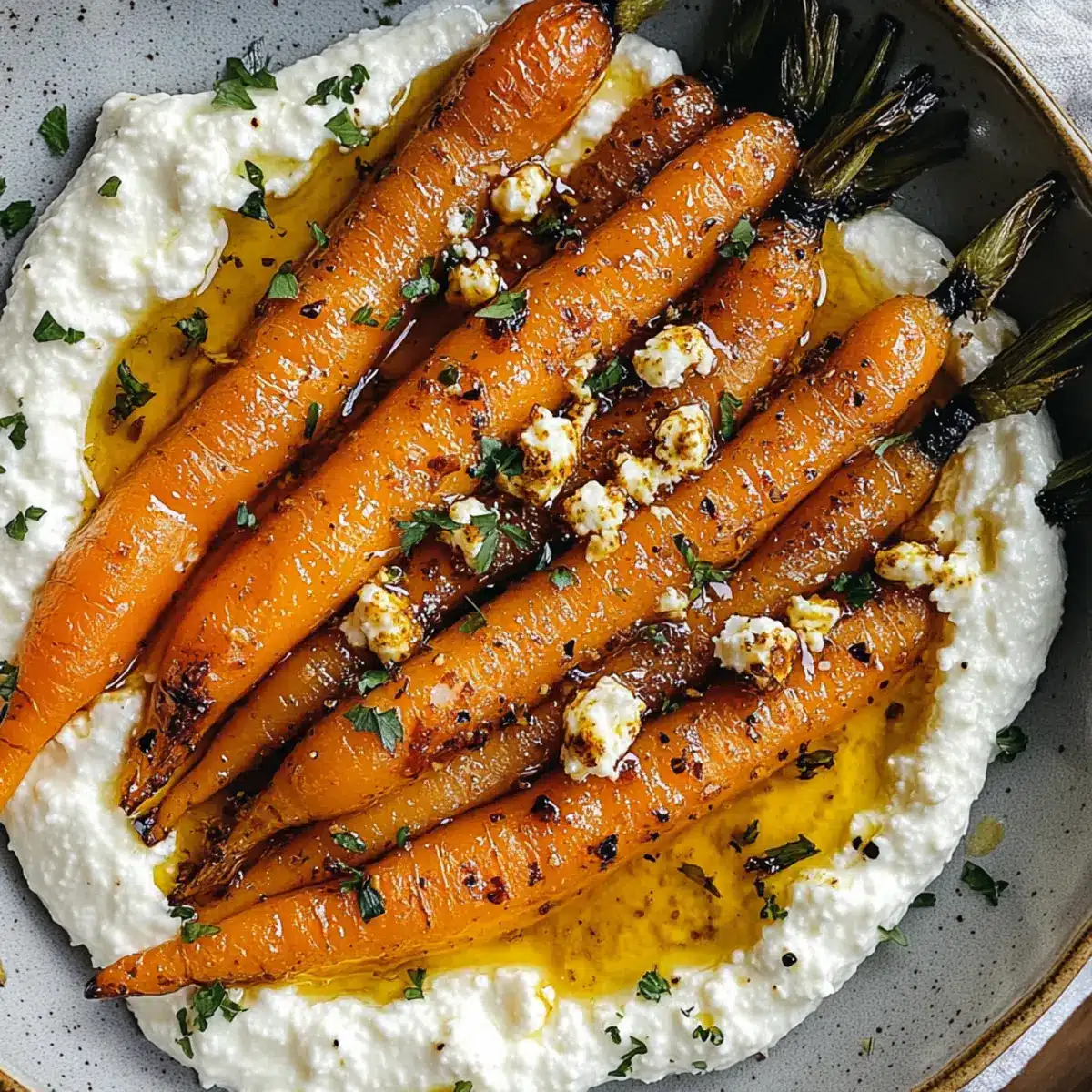 Genießen Sie diese gerösteten Karotten mit geschlagenem Ricotta und scharfem Honig als perfektes Beispiel für frische, einfache und köstliche Präsentation!