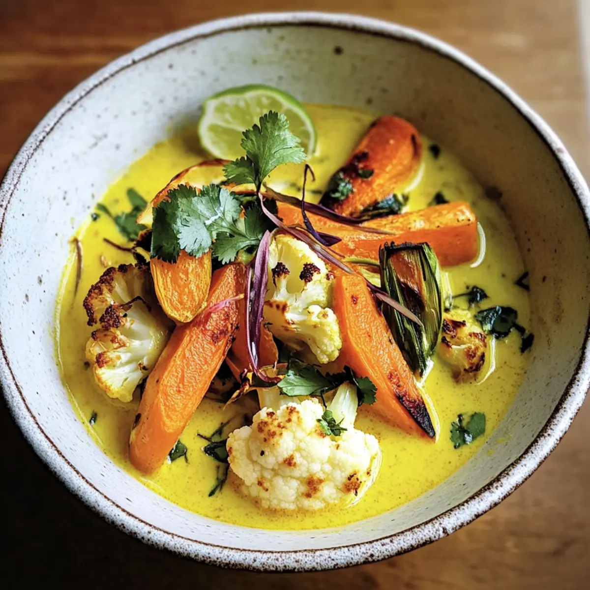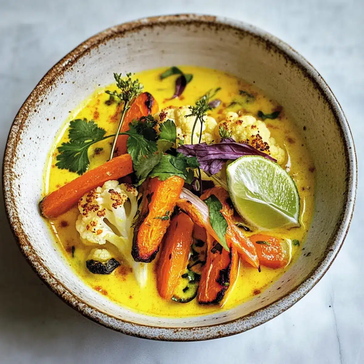 Sobald das Gemüse fertig geröstet ist, füge es vorsichtig zur Brühe hinzu. Rühre die Mischung gut um, damit sich die Aromen entfalten können. Serviere die gewürzte Kurkuma-Brühe in Schalen und garniere sie mit frischem Koriander und einem Spritzer Limettensaft für eine erfrischende Note vor dem Servieren.