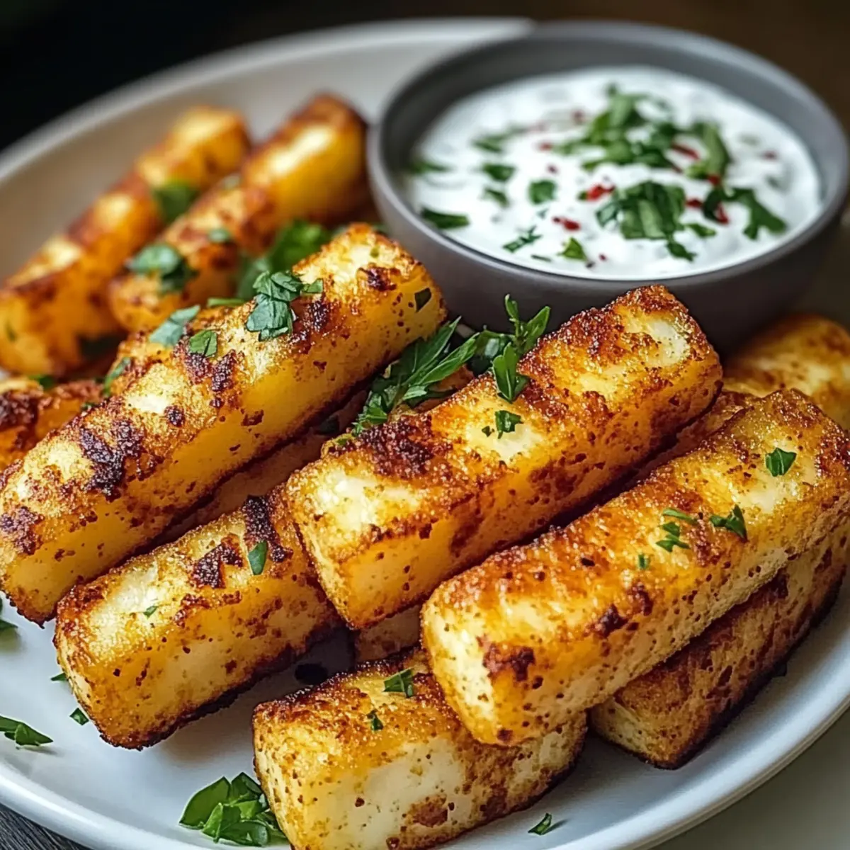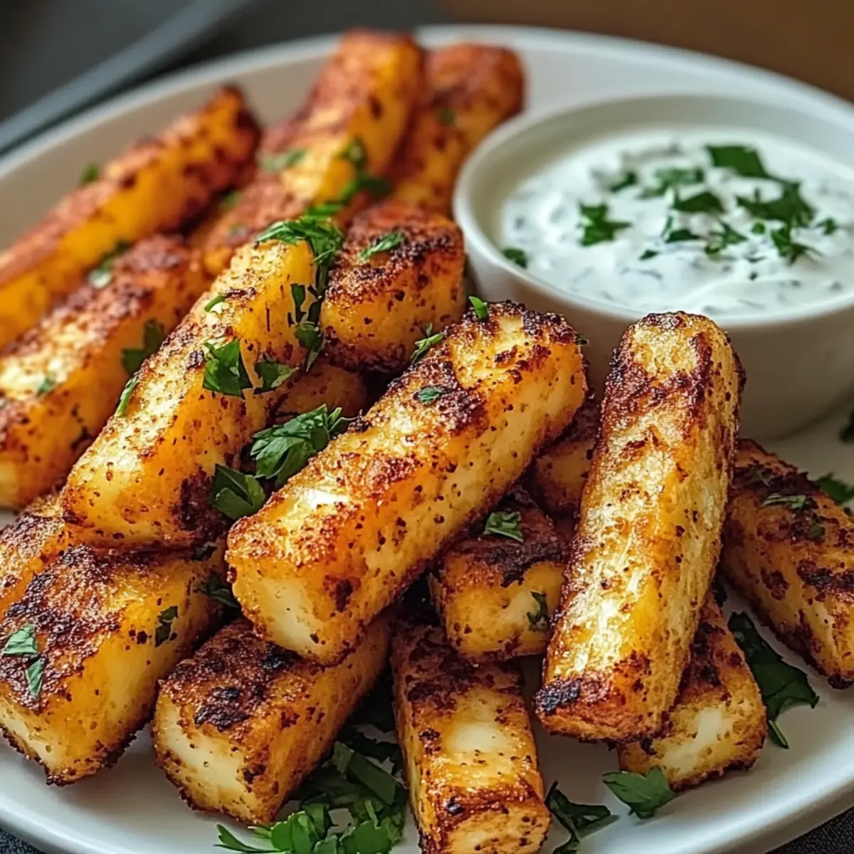 Knusprig und lecker: Die Kombination aus knusprigen Halloumi-Pommes und dem würzigen Joghurt-Dip sorgt für ein Geschmackserlebnis, das deine Gäste begeistern wird.