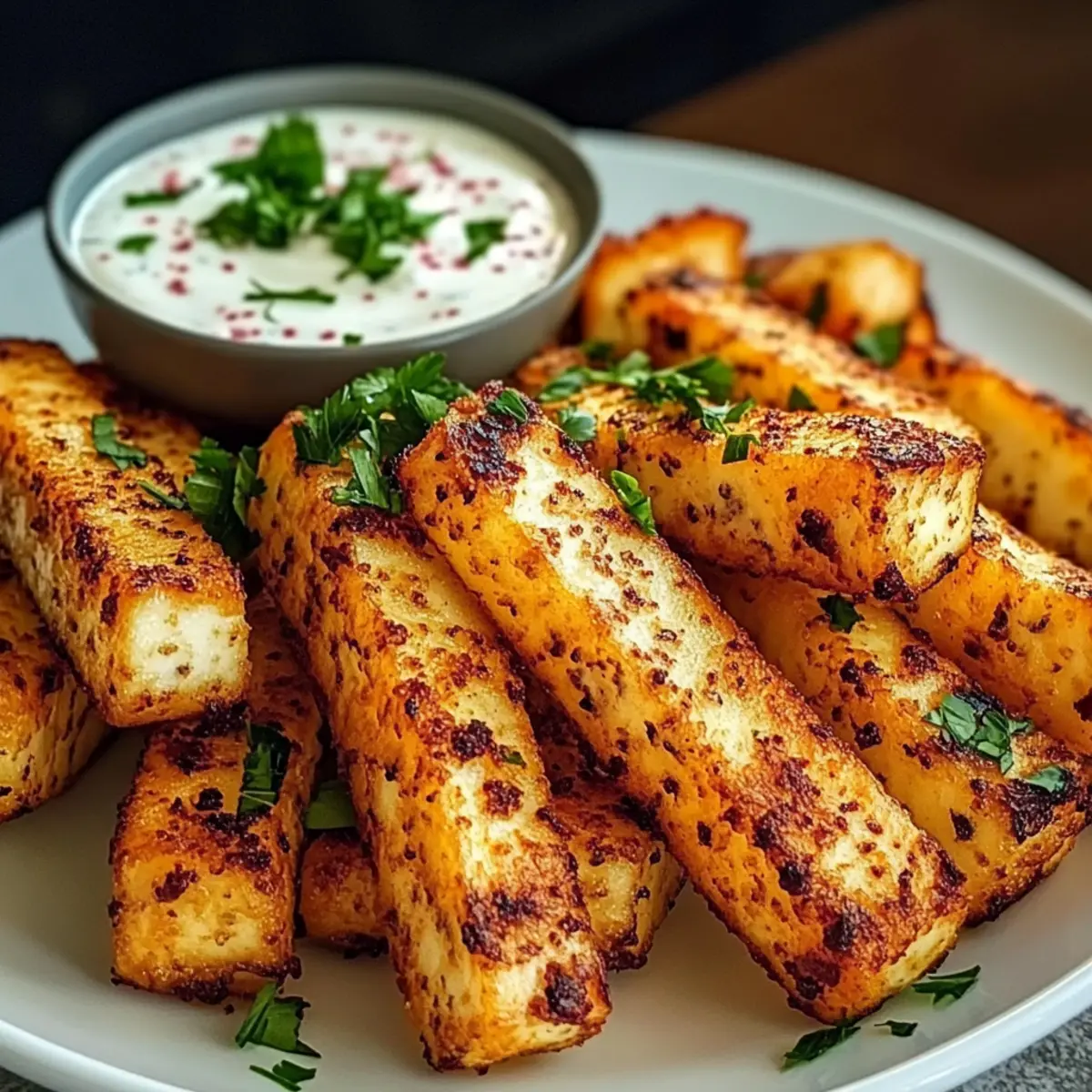 Die Halloumi-Pommes mit würzigem Joghurt-Dip sind perfekt für stressfreie Meal Prep! Du kannst die Halloumi bereits bis zu 24 Stunden im Voraus schneiden und mit Olivenöl sowie den Gewürzen marinieren. Bewahre die vorbereiteten Halloumi-Streifen in einem luftdichten Behälter im Kühlschrank auf, um ihre Frische zu erhalten. Am Tag des Servierens heizt du den Air Fryer auf 200 °C vor und garst die Pommes für 15–20 Minuten, bis sie goldbraun und knusprig sind. Für den Dip kannst du ebenfalls alles vorbereiten; simply den Joghurt, Zitronensaft und Gewürze zusammenmischen, sodass es geschmacklich frisch bleibt. So hast du im Handumdrehen eine köstliche Snackoption, die im Alltag Zeit spart!