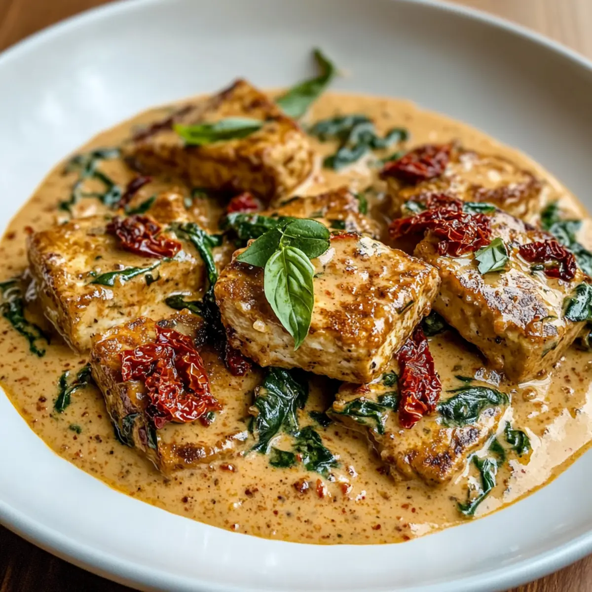 Vereine schließlich die knusprigen Tofu-Scheiben vorsichtig mit der cremigen Sauce in der Pfanne und lasse sie für ein oder zwei Minuten gemeinsam erhitzen. Serviere den „Heirate Mich“-Tofu dann mit frischem Basilikum garniert. Diese himmlische Kombination bietet einen wunderbaren Anblick und eignet sich hervorragend als Beilage zu Reis oder glutenfreier Pasta.