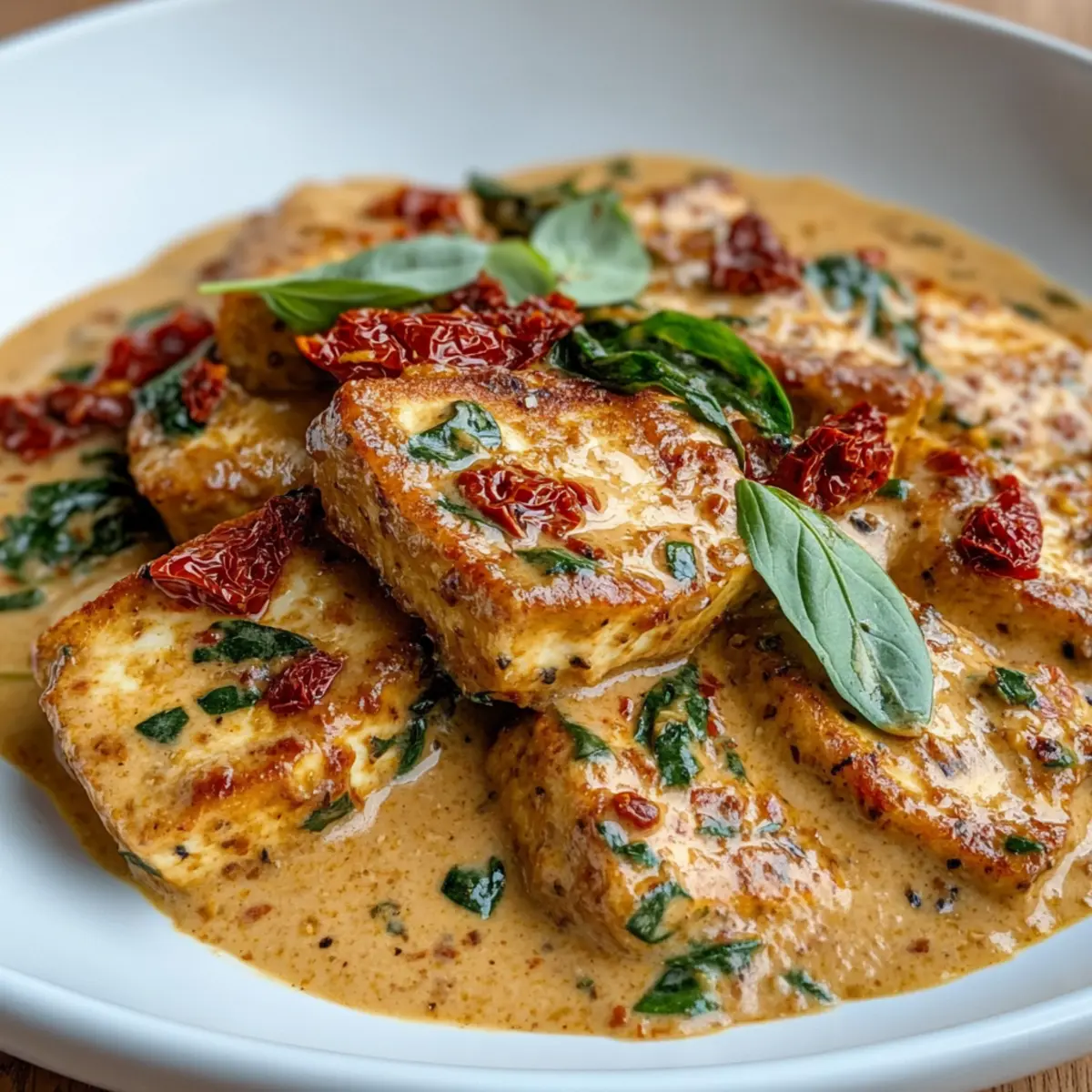 - Vereine die knusprigen Tofu-Scheiben vorsichtig mit der cremigen Sauce in der Pfanne und lasse sie für ein oder zwei Minuten gemeinsam erhitzen. Serviere den Tofu dann mit frischem Basilikum garniert.