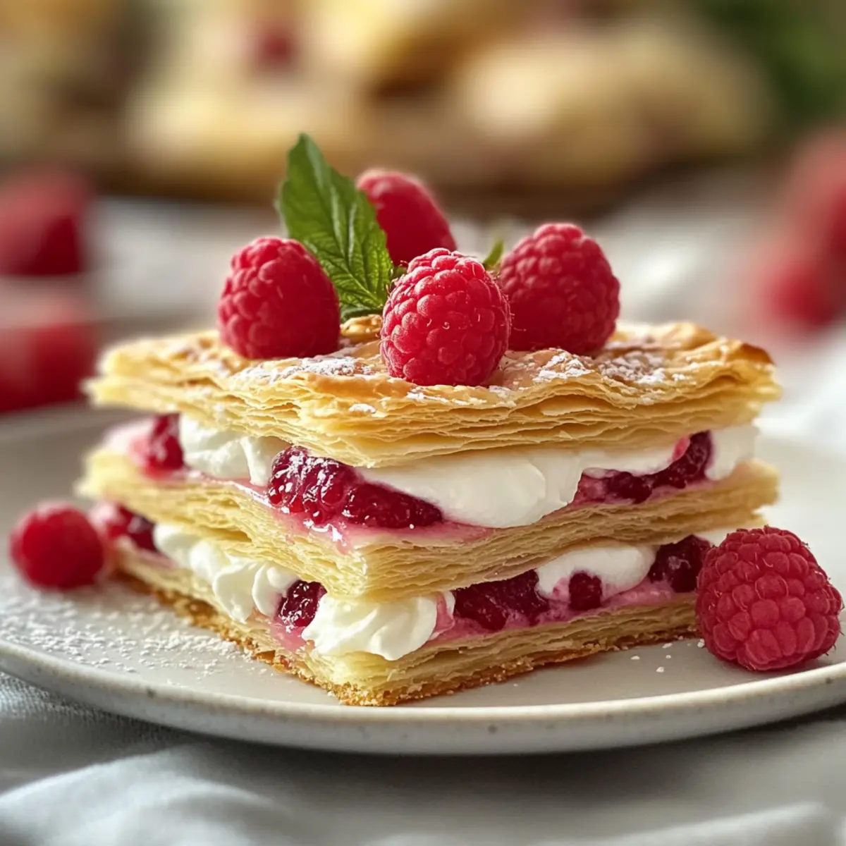 - Verteilen Sie die Sahnefüllung auf der Hälfte der Blätterteigstücke, toppen Sie sie mit der Himbeermischung und legen Sie die übrigen Teigstücke darauf.