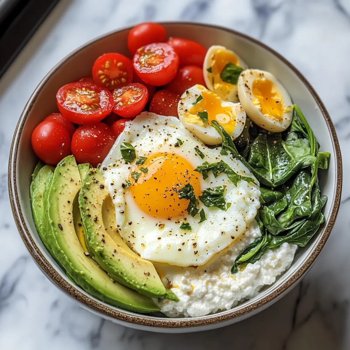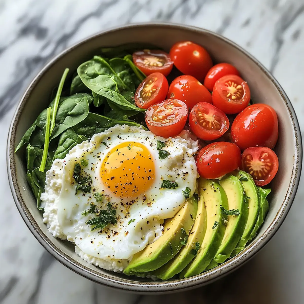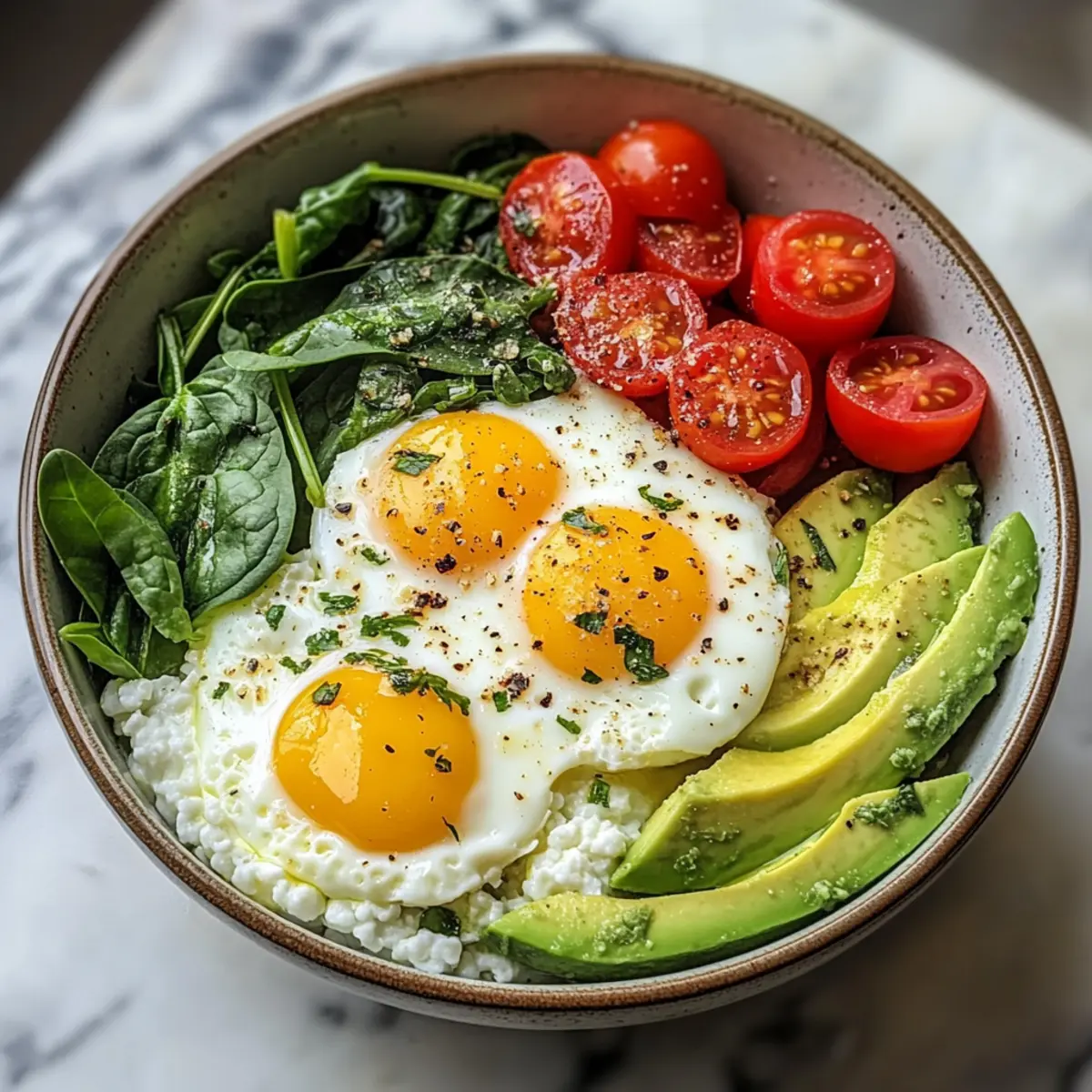 - Schüssel zusammenstellen: Gib Hüttenkäse in eine Schüssel, platziere die Eier, arrangiere Spinat, Avocado und Cherrytomaten.