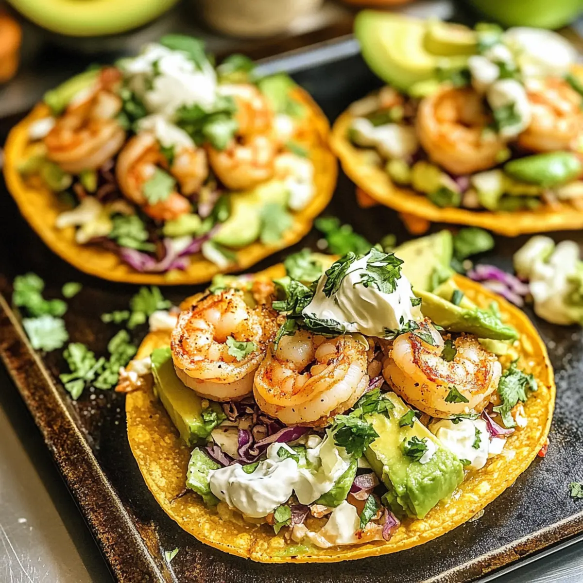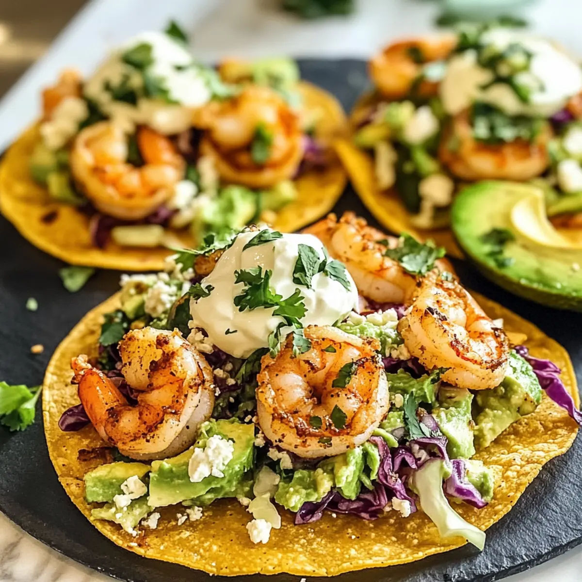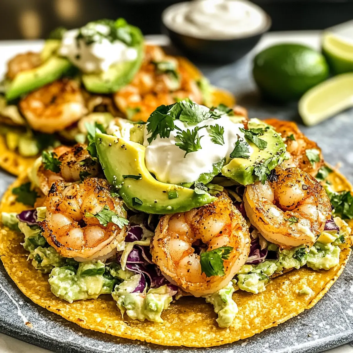 - Bedecke jede knusprige Tortilla zuerst mit der frisch zubereiteten Slaw, gefolgt von den sautierten Garnelen. Füge einige Avocadoscheiben hinzu und kröne das Ganze mit einem Klecks Sauerrahm oder griechischem Joghurt.
