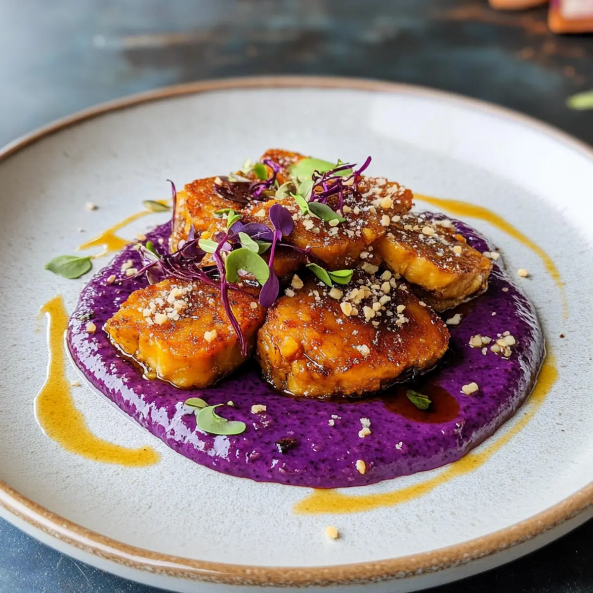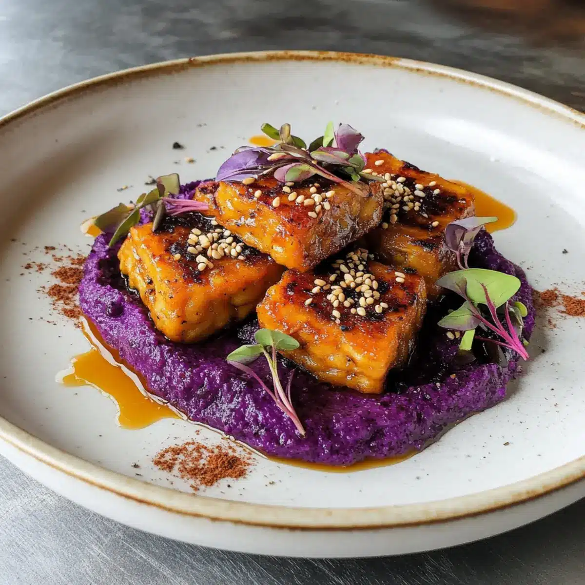 Nehme einen tiefen Teller und gebe eine großzügige Portion des lila Süßkartoffelpürees in die Mitte. Lege die knusprigen Tempeh-Scheiben darauf und träufle das Miso-Karamell großzügig darüber. Zum Schluss garniere das Gericht nach Belieben mit gerösteten Sesamsamen und essbaren Blumen für eine besondere Präsentation.