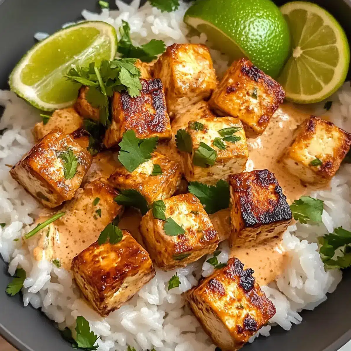 - Richte den Jasminreis auf Tellern an und serviere den Kokosnuss-Limetten-Tofu darüber. Garniere mit Limettenvierteln und frischem Koriander.