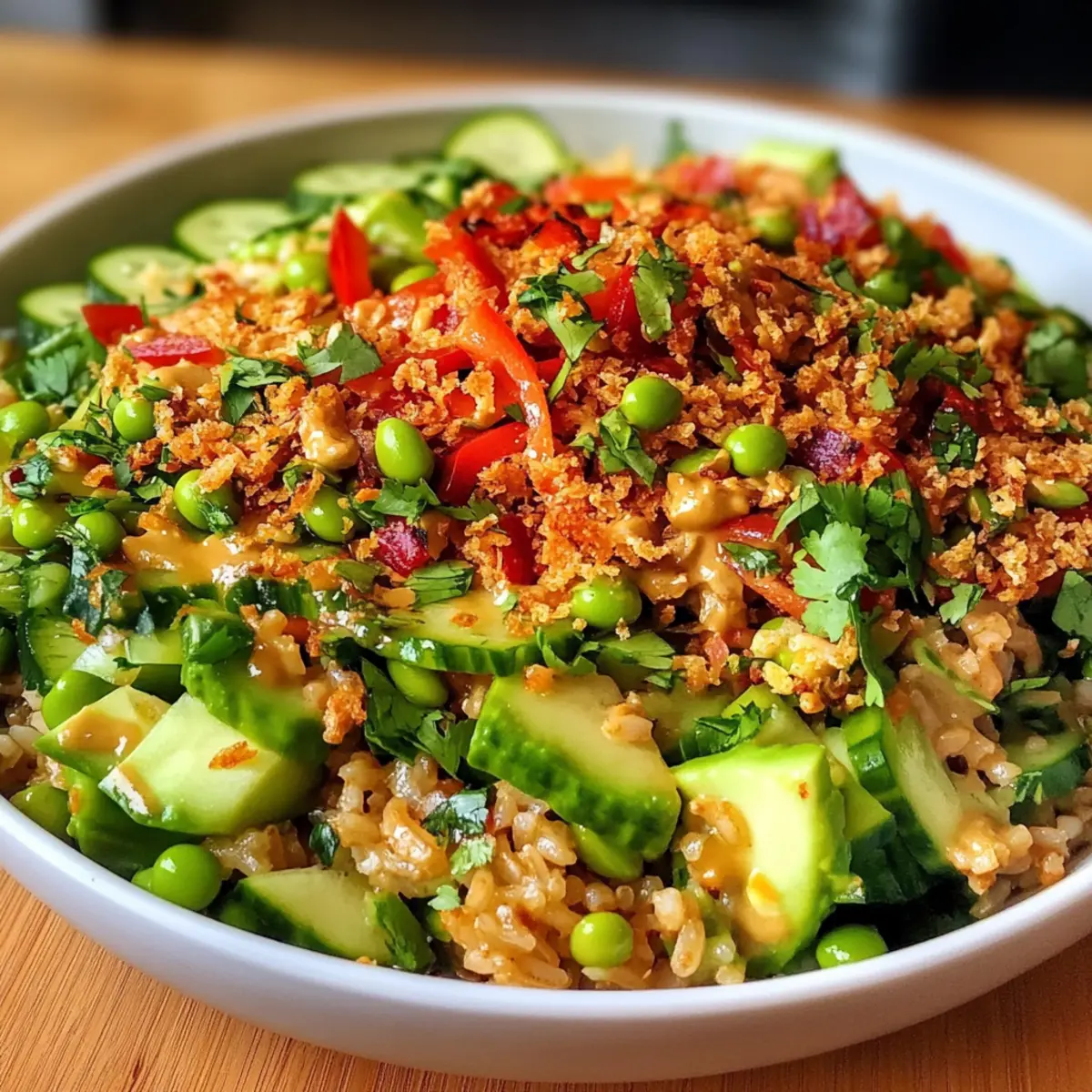 Träufle das Dressing großzügig über die vorbereiteten Salatzutaten. Füge den knusprigen Reis obenauf und mische alles vorsichtig, damit die Zutaten gut integriert werden. Zum Schluss garnierst du den Salat mit gehackten Erdnüssen und eventuell etwas zusätzlichem Chiliöl oder Sriracha für mehr Schärfe. Der Salat sollte sofort serviert werden, um die Texturen zu bewahren.