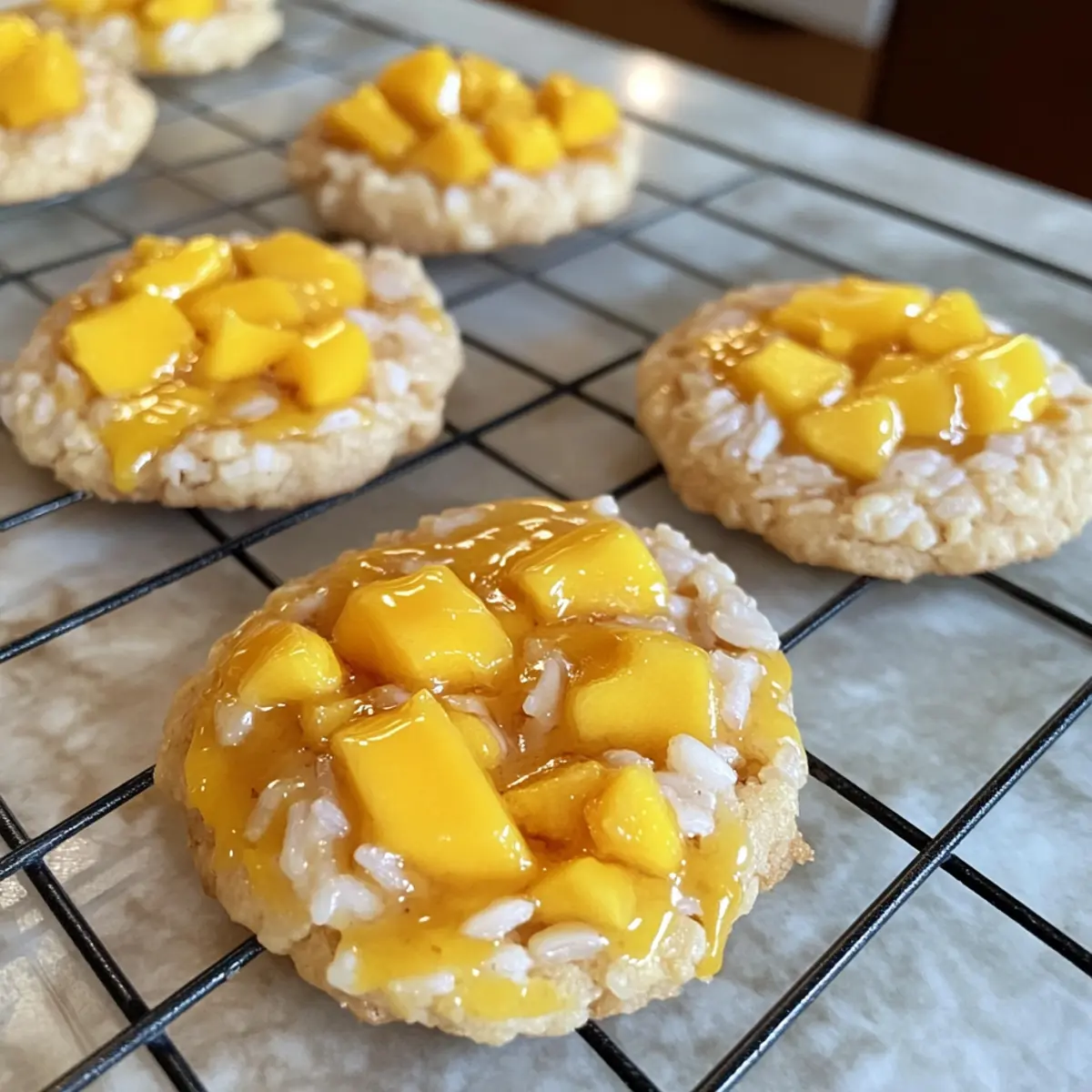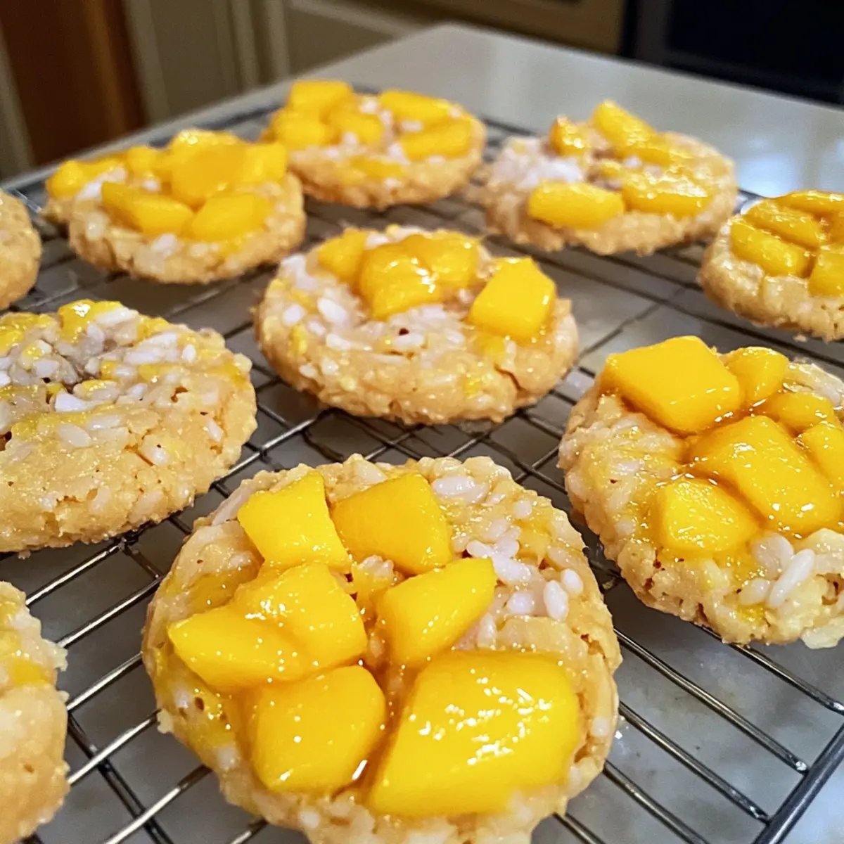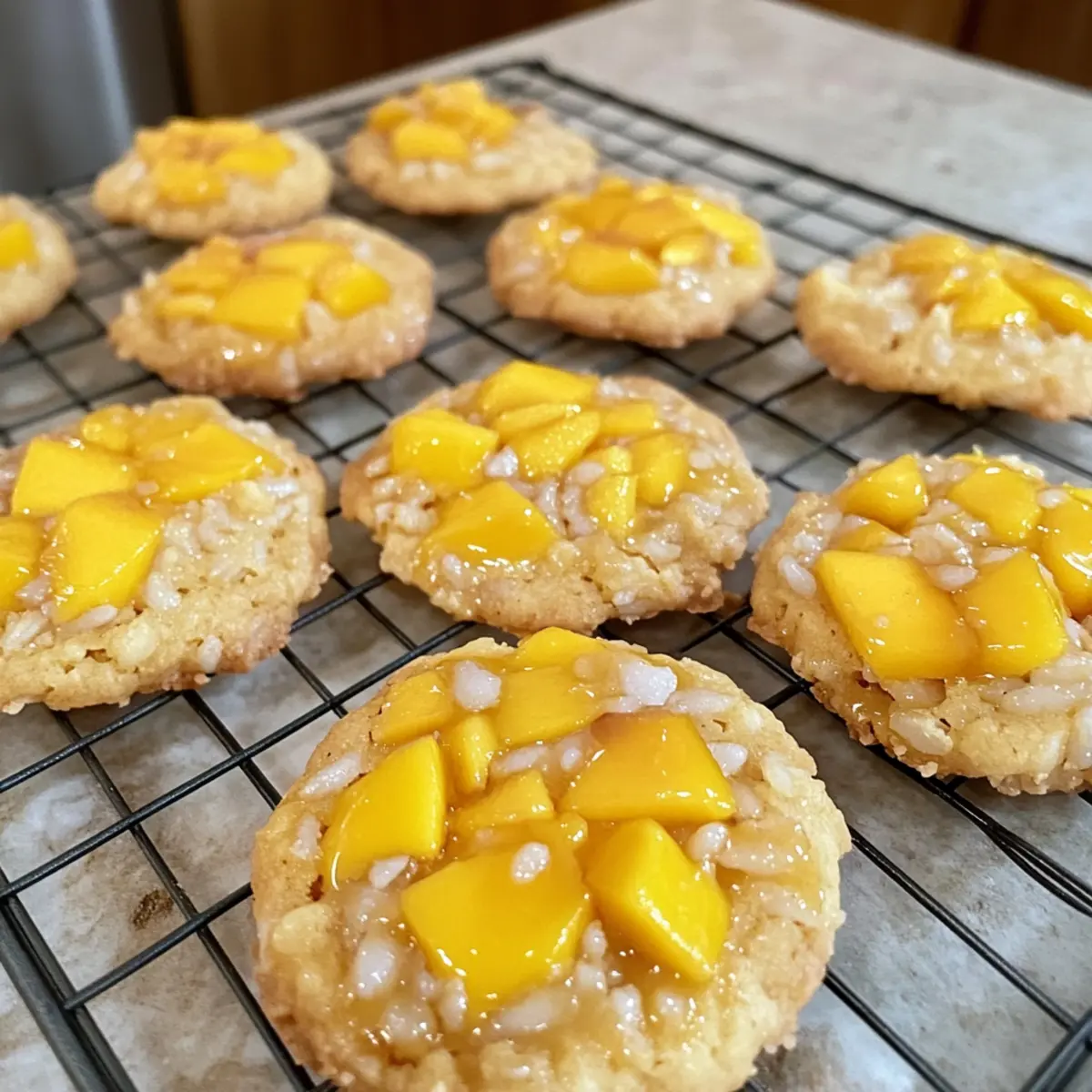 Die Kekse sofort nach dem Backen auf ein Drahtgitter legen, damit sie abkühlen und nicht durch Dampf weich werden. Dies ist ein wichtiger Schritt, um die knusprige Außenseite der Mango Klebreis Kekse zu bewahren, während das Innere zart bleibt.