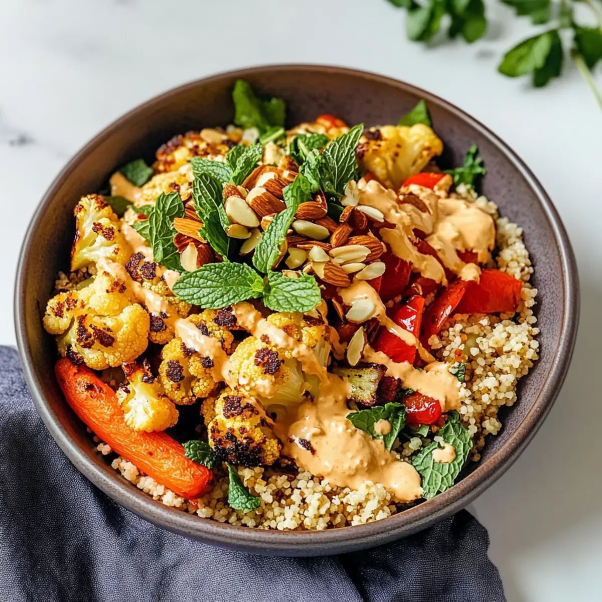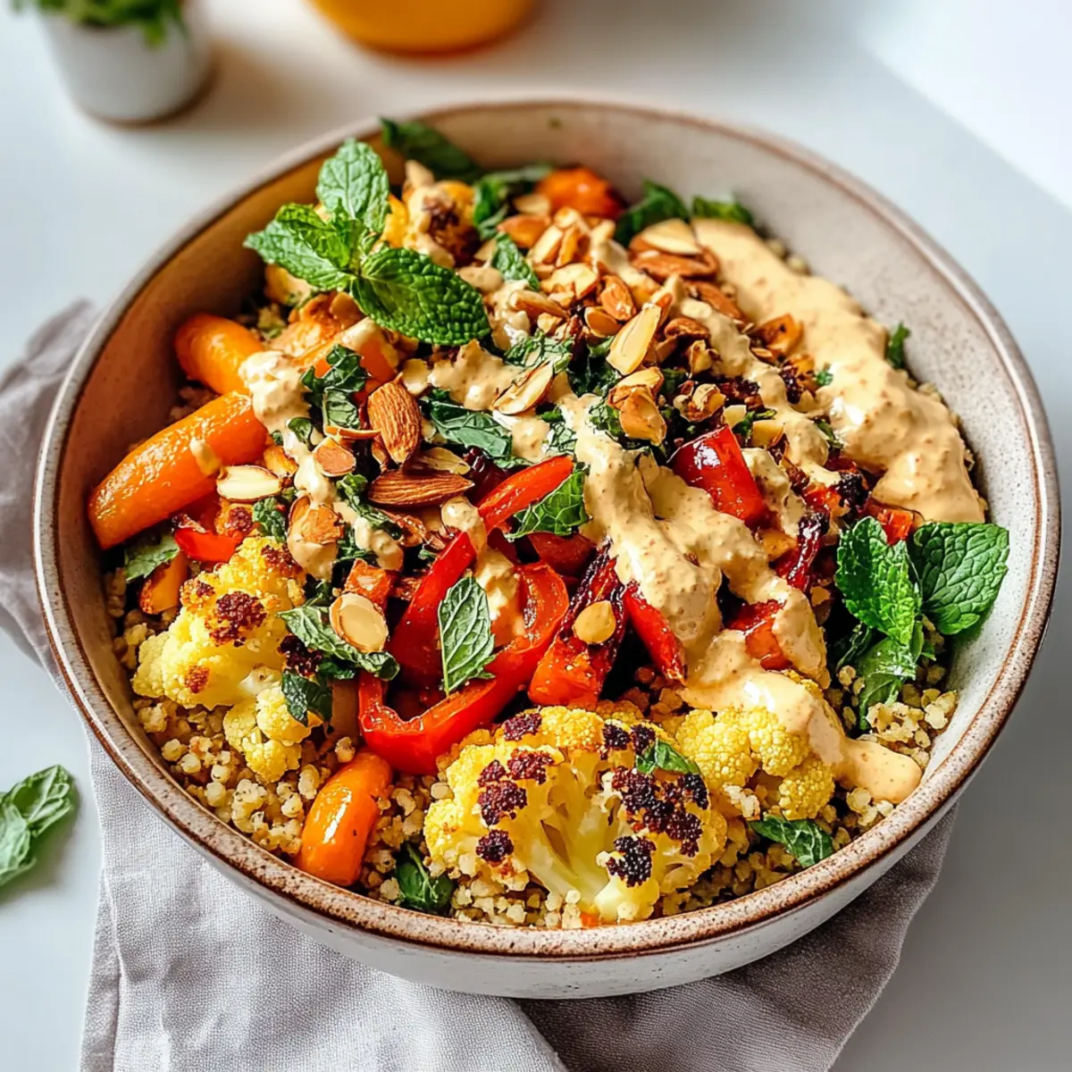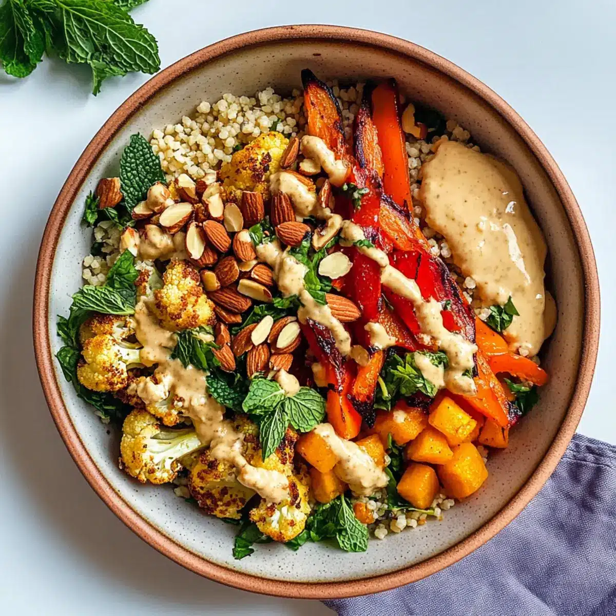 Vielfältige Optionen: Die marokkanisch inspirierte Nährschüssel lässt sich leicht anpassen, sei es mit Quinoa für eine glutenfreie Variante oder Tofu für zusätzlichen Proteinschub. Farbenfrohe Zutaten: Die Kombination aus buntem Gemüse und aromatischen Gewürzen verwandelt jede Schüssel in ein wahres Kunstwerk. Schnell und unkompliziert: In weniger als 30 Minuten bist du bereit, ein gesundes und leckeres Essen auf den Tisch zu bringen. Nährstoffreich und herzhaft: Diese Schüssel bietet nicht nur eine Geschmacksexplosion, sondern ist auch vollgepackt mit pflanzlichen Proteinen und Ballaststoffen, ideal für eine ausgewogene Ernährung. Perfekte Mischung: die Texturen der gerösteten Gemüse, des cremigen Tahini und der knackigen Mandeln schaffen ein unvergleichliches Esserlebnis. Entdecke auch unseren kompletten Guide zu gesunden Bowl-Rezepten, um noch mehr köstliche Ideen zu sammeln!