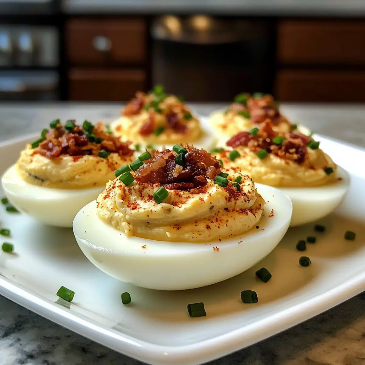 Bestreuen Sie die gefüllten Eier mit den reservierten Speckstücken für zusätzlichen Crunch. Fügen Sie dann eine Prise geräuchertes Paprika hinzu, um eine attraktive Farbe und einen zusätzlichen Geschmacksschub zu bieten. Optional können Sie mit frischen Schnittlauchröllchen garnieren für noch mehr Frische und einen Hauch von Farbe.