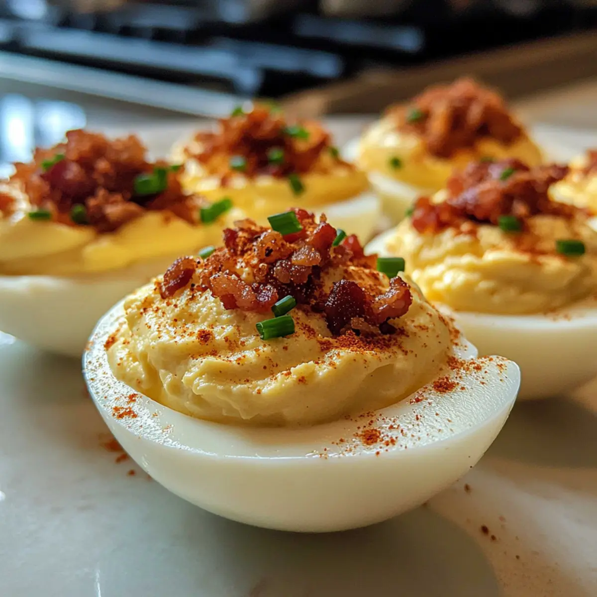 - Bestreuen Sie die gefüllten Eier mit den reservierten Speckstücken und geräuchertem Paprika. Garnieren Sie optional mit frischem Schnittlauch.