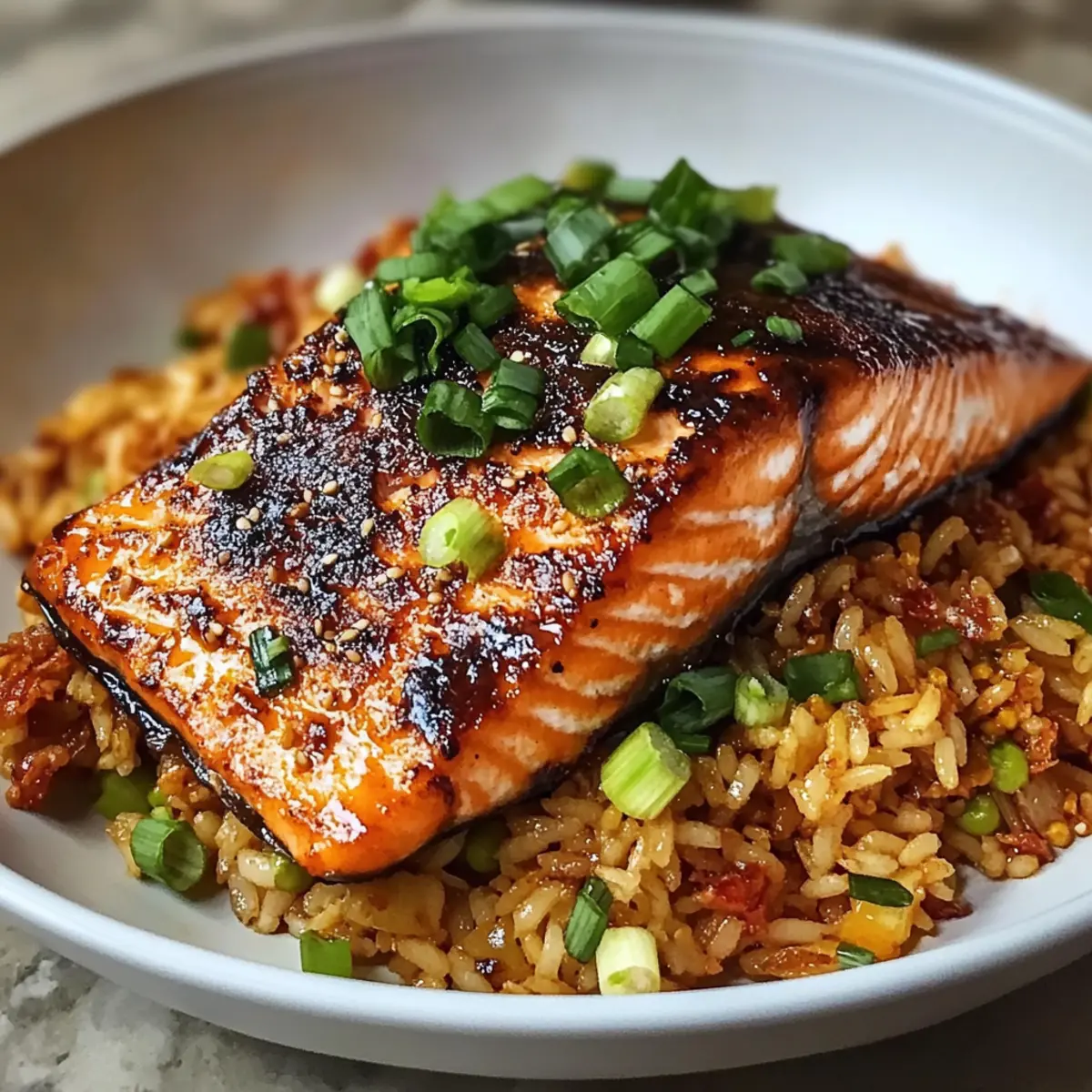- Verteile den Kimchi-Reis auf Tellern, lege den Lachs darauf und garniere nach Wunsch. Sofort servieren.