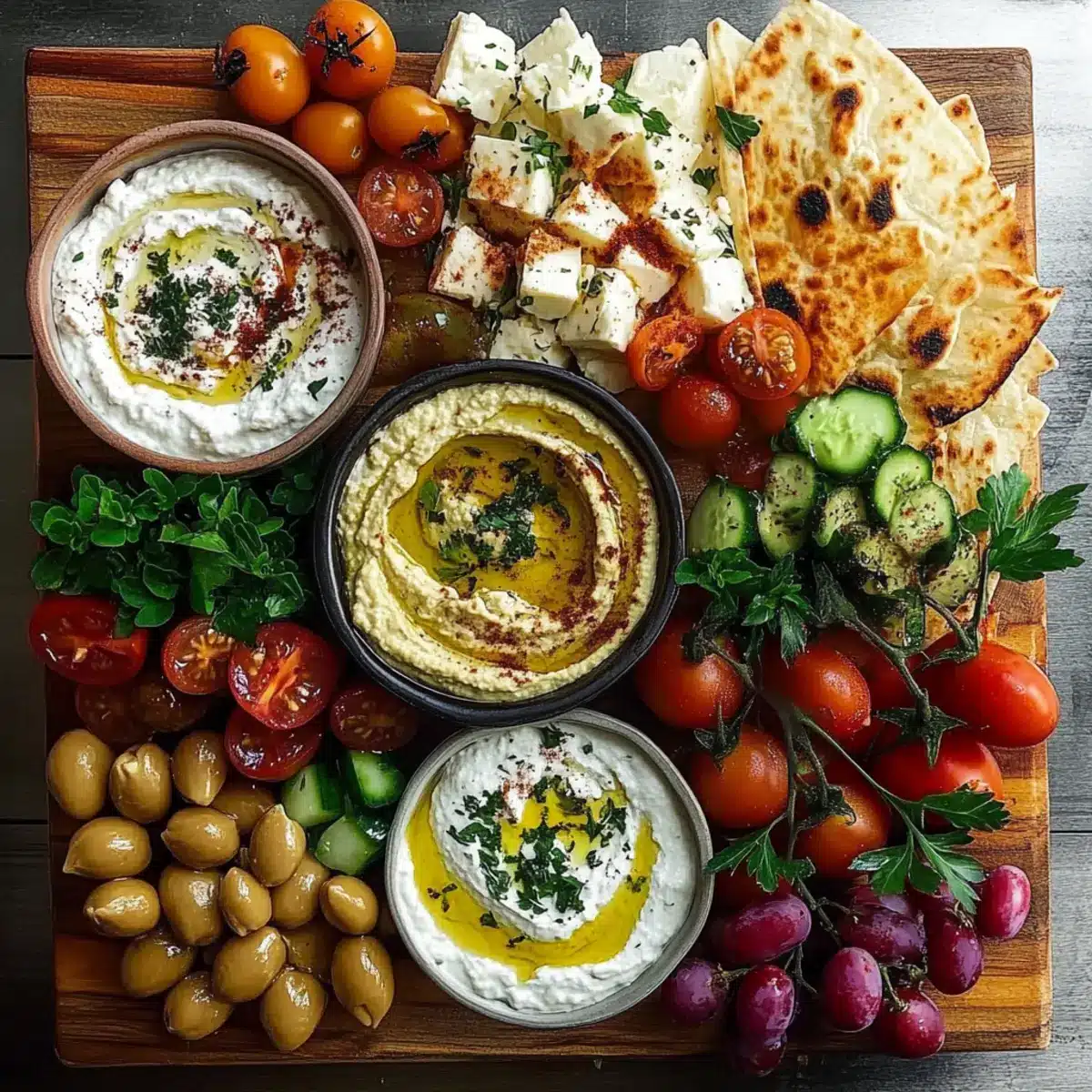- Dips anrichten: Hummus, Baba Ghanoush und Tzatziki in Schalen füllen oder auf dem Servierbrett anrichten. Mit Olivenöl beträufeln und optional mit Dill garnieren.