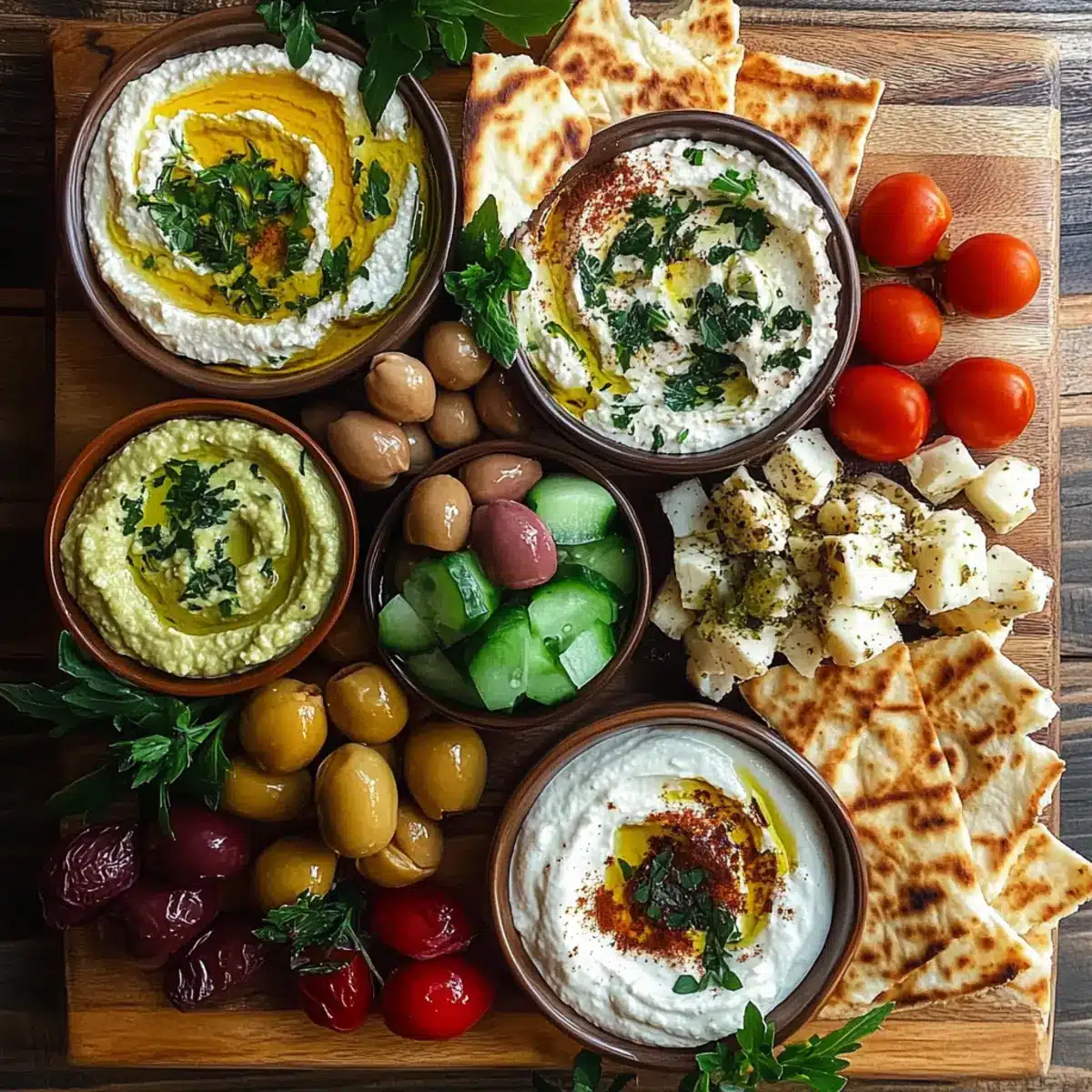 - Die Tafel zusammenstellen: Dips, Kichererbsensalat und weitere Zutaten strategisch auf dem Brett anrichten. Kurz vor dem Servieren Olivenöl und Zitronensaft über den Salat träufeln.