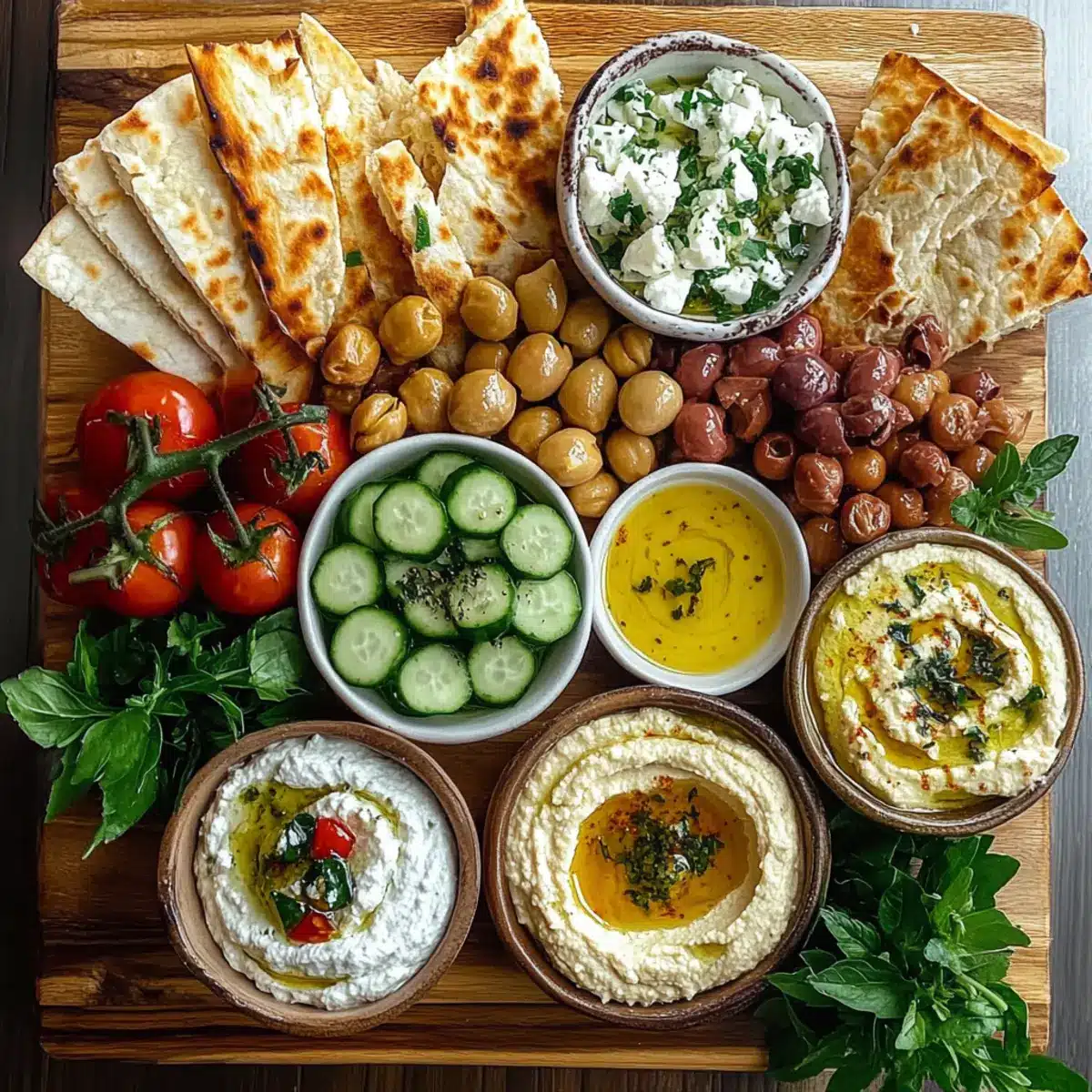 Wärme das Pita-Brot oder die Fladenbrote in einer Pfanne oder im Ofen bei 180°C für etwa 5 Minuten, bis sie leicht knusprig sind. Lege das erwärmte Brot zusammen mit ausgewählten Crackern oder Baguettescheiben auf das Brett. Diese dienen als ideale Begleiter für die köstlichen Dips auf deinen Mittelmeers Brunch Tafeln.