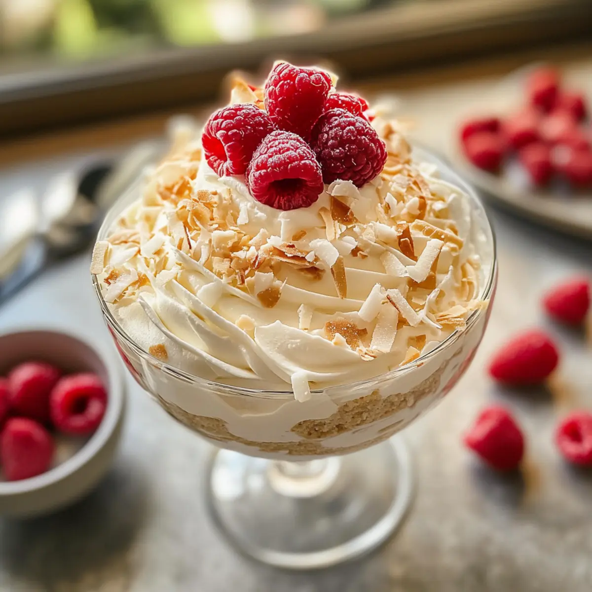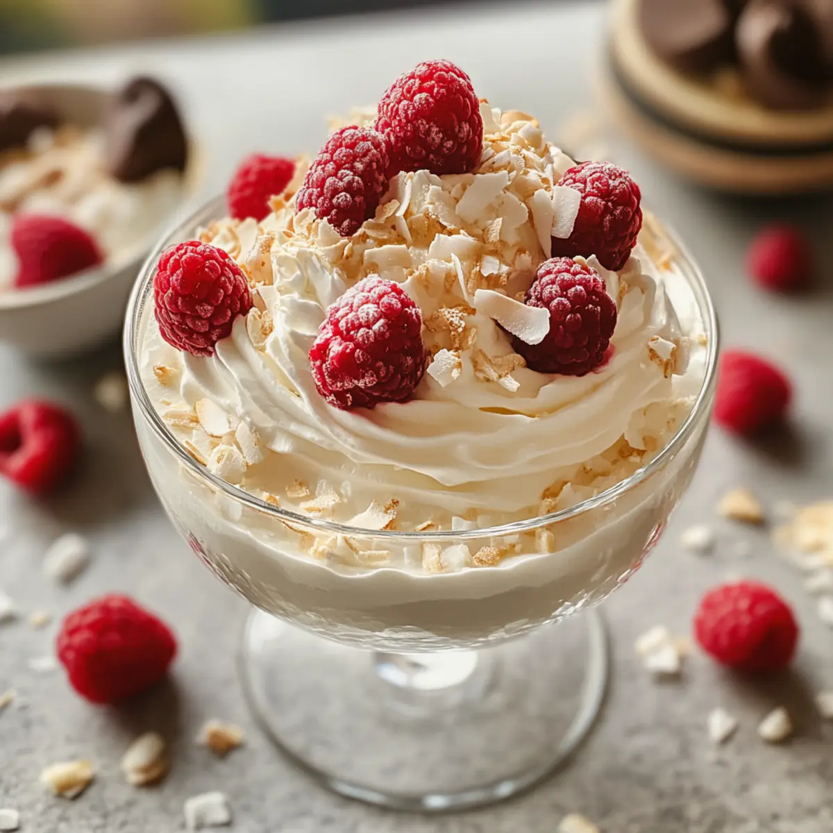 Köstlicher Genuss: Das Raffaello-Weihnachtsdessert begeistert mit einer harmonischen Kombination aus Kokosnuss und Himbeeren, perfekt für festliche Tage.