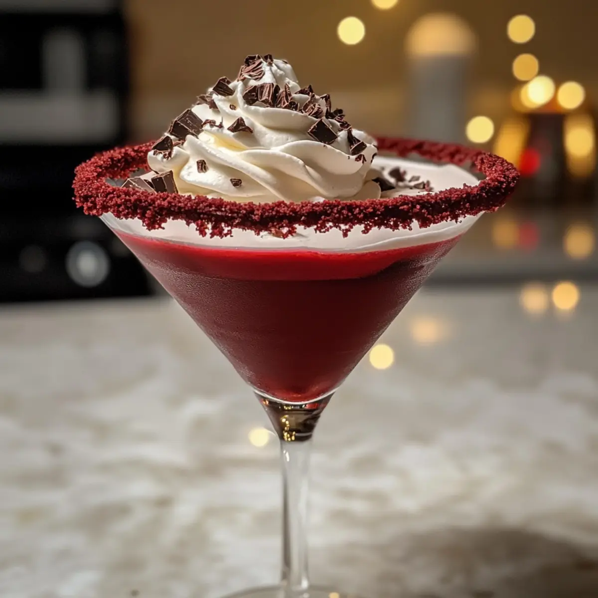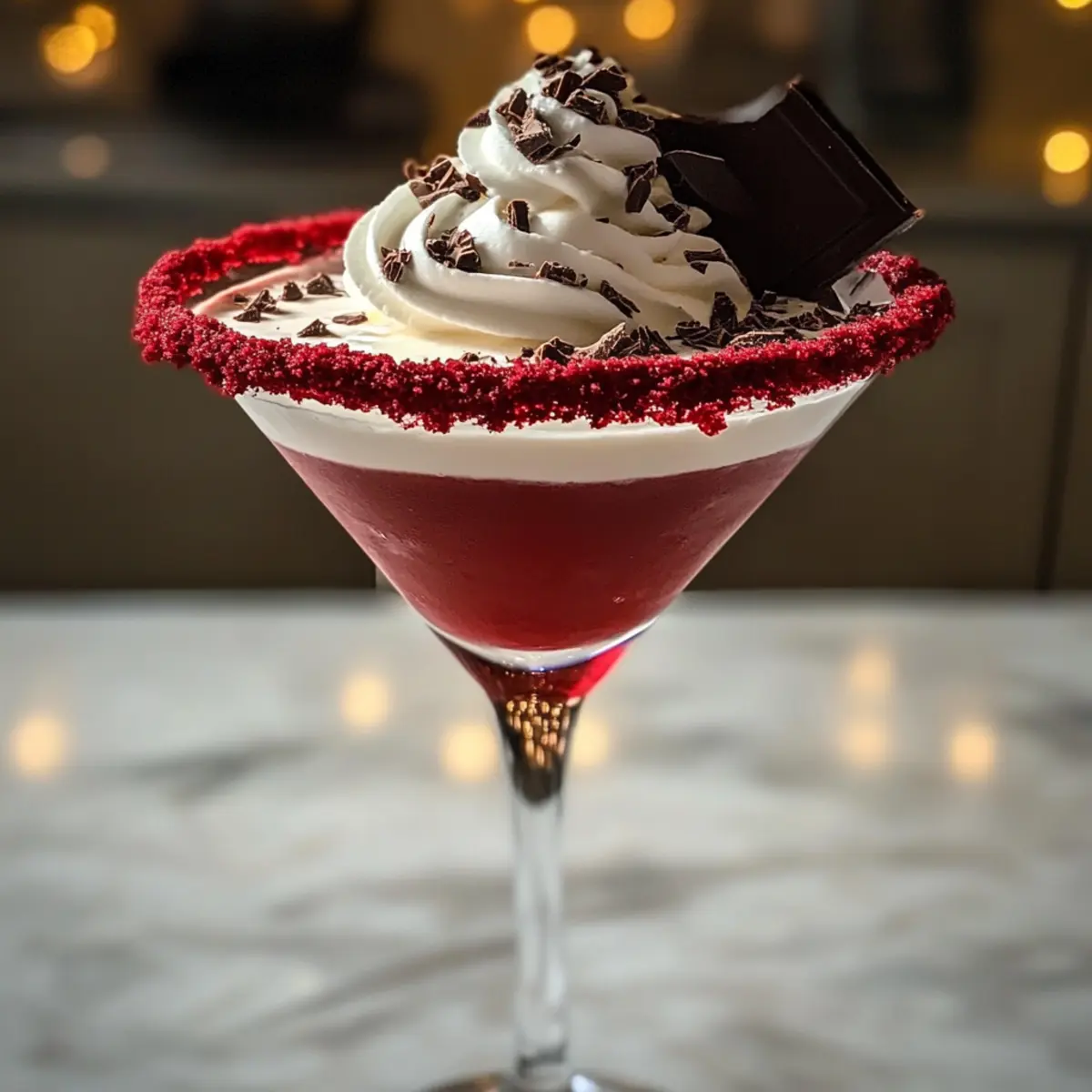 Garnieren den Rotsamtsch Martini mit einem Klecks Schlagsahne auf der Oberseite sowie einigen Schokoladenspänen oder einem kleinen Stück Rotsamtsch-Cake. Diese Dekoration sorgt für einen ansprechenden und festlichen Look, der dem luxuriösen Geschmack des Cocktails gerecht wird.