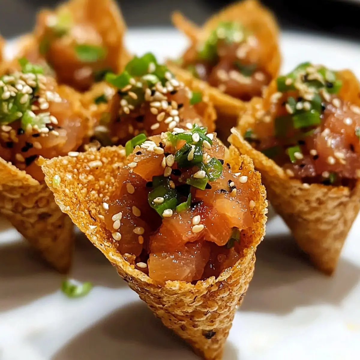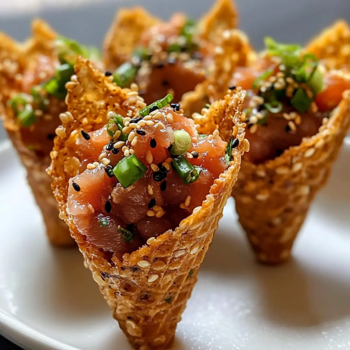 Zum Schluss garniere die gefüllten Scharfe Thunfisch Sesam Miso Tüten mit zusätzlichen geschnittenen Frühlingszwiebeln, Masago-Rogen und gehacktem eingelegtem Ingwer. Träufle vorsichtig etwas von der Sojasauce-Wasabi-Mischung und streue Buchto-Flocken darüber für einen perfekten Abschluss. Serviere die Tüten sofort, um den Gästen die frischeste und knusprigste Erfahrung zu bieten.