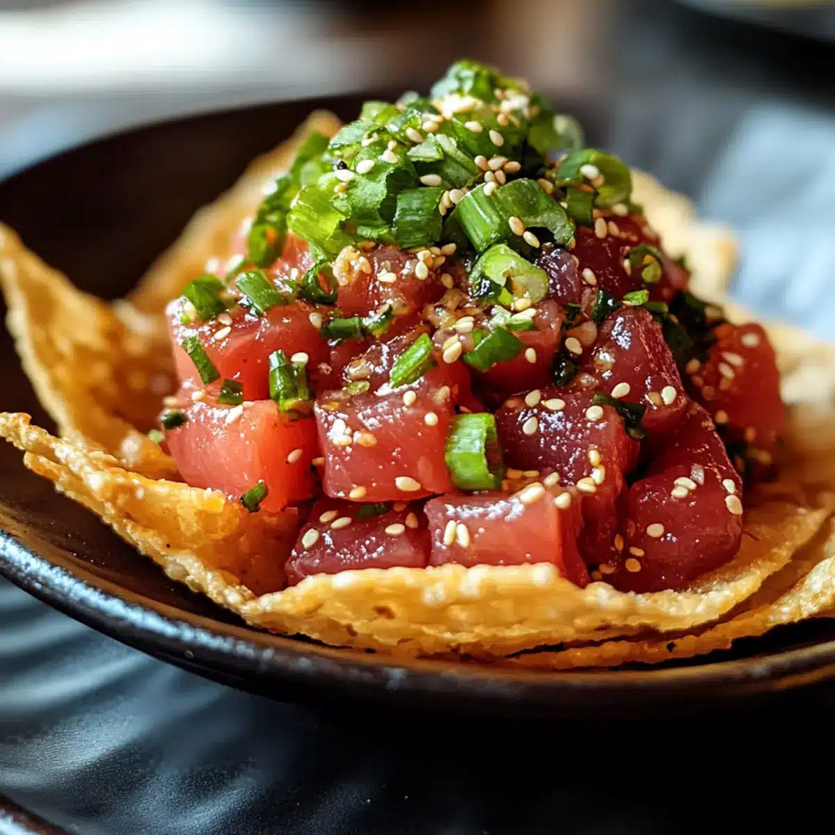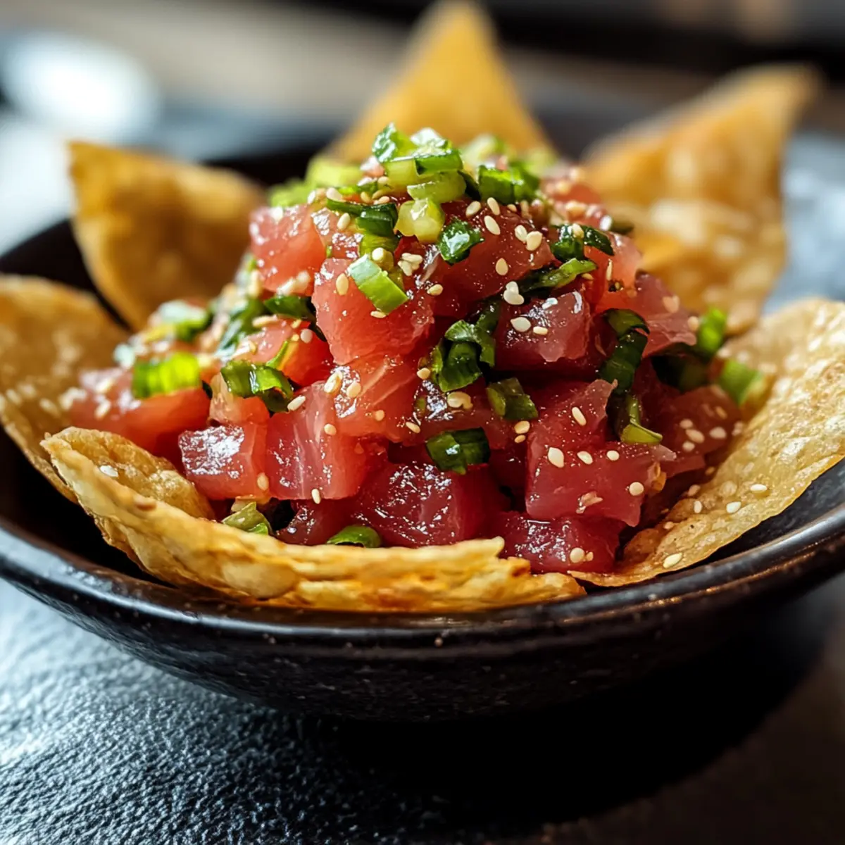 Garnieren die köstlichen Chips nach Belieben mit Sesamkörnern, zusätzlichen gehackten Frühlingszwiebeln oder kleinen Avocado-Stücken für ein ansprechendes Finish. Diese zusätzlichen Zutaten sorgen für Farbe und verbessern den Geschmack des Scharfen Thunfisch-Tatars auf knusprigen Wontonschips.