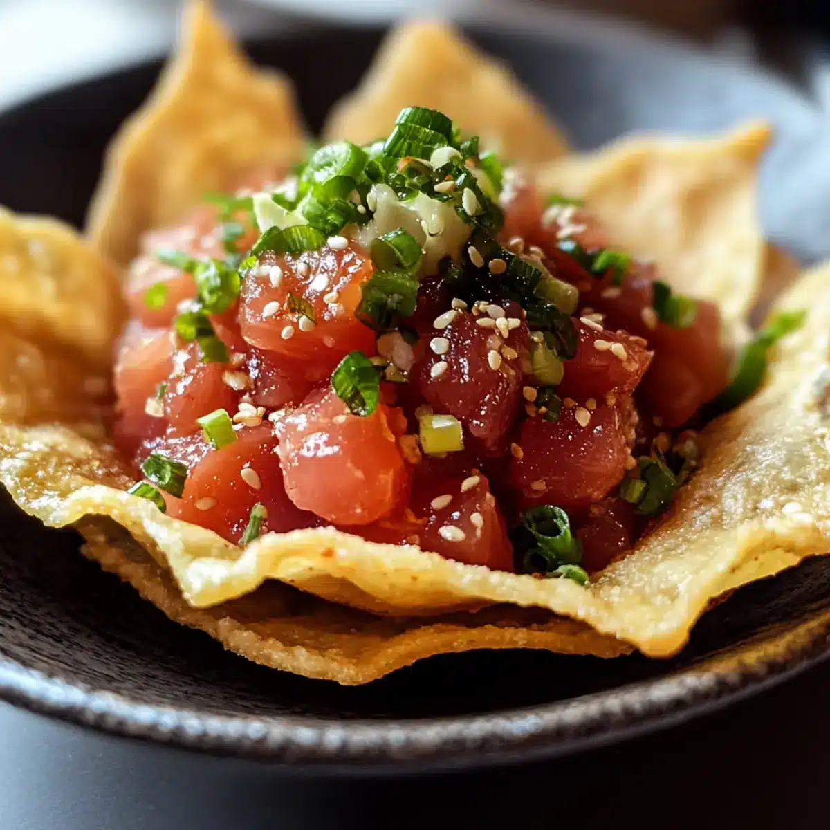 Scharfer Thunfisch-Tatar auf Wontonschips genießen