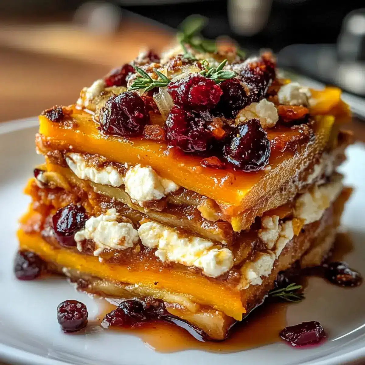 Verteile die Cranberry-Honig-Glasur großzügig zwischen den Schichten, um eine zusätzliche Geschmackstiefe zu erreichen. Träufle etwas mehr Glasur auf die oberste Schicht, um beim Backen einen glanzvollen Effekt zu erzielen. Diese schichtige Süßkartoffel-Bucheckern-Karotten-Lasagne gewinnt dadurch an Farbe und Aroma.