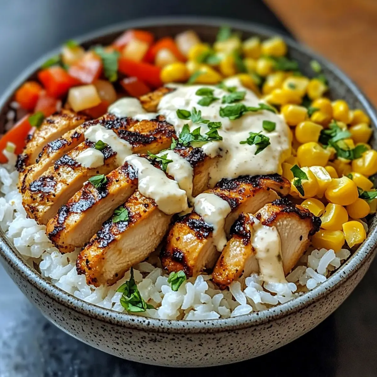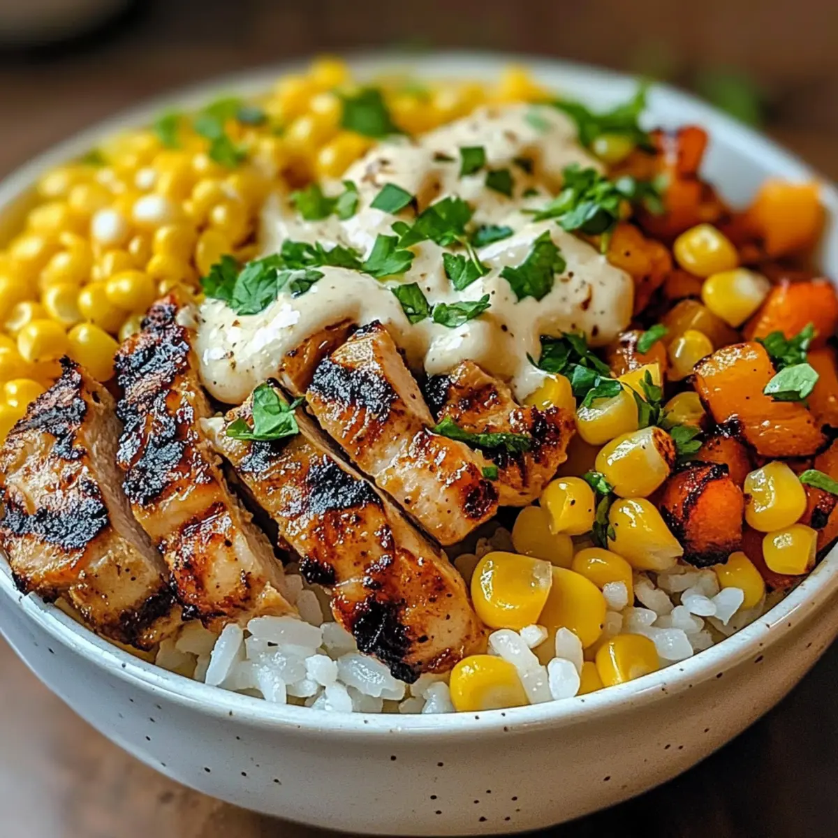 Servieren Sie den zubereiteten Reis in dekorativen Schalen. Platzieren Sie das gewürzte Hähnchen und das gegrillte Gemüse darauf. Fügen Sie großzügig den cremigen Mais-Dip hinzu und garnieren Sie die Bowl nach Belieben mit zusätzlichen frischen Kräutern oder Avocadoscheiben für einen zusätzlichen Frischekick.
