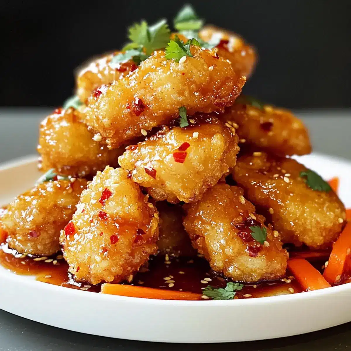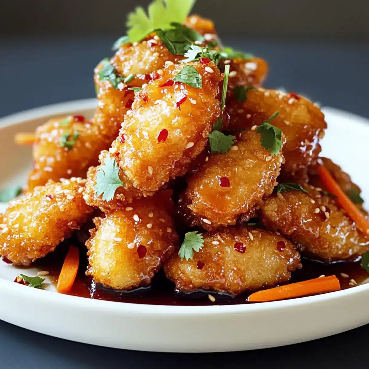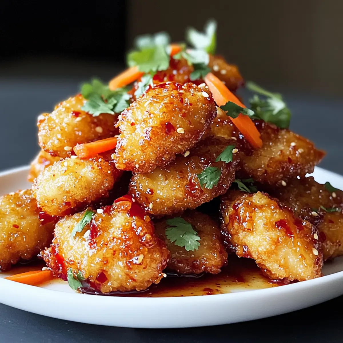 - Gib die überzogenen Nuggets auf einen Servierteller und garniere sie mit julienned Karotten, frischem Koriander und Sesamkörnern.
