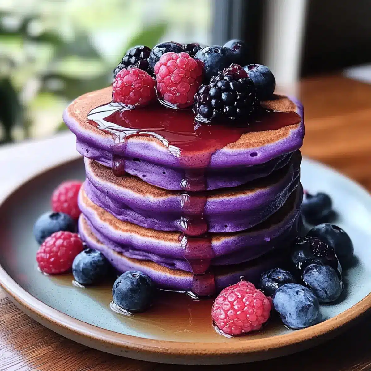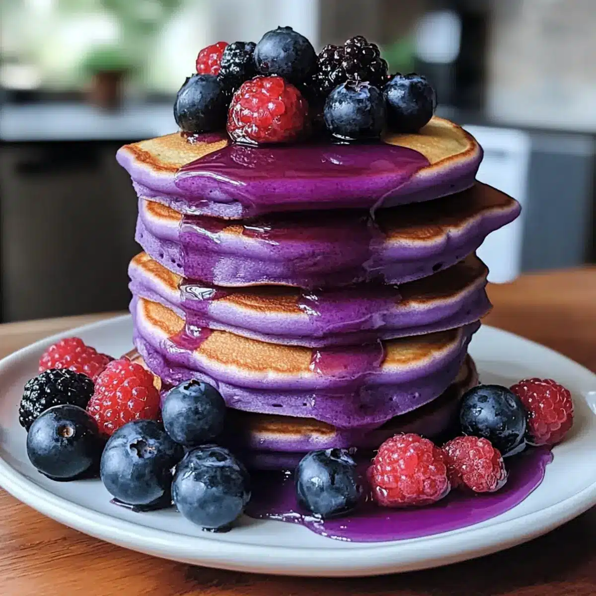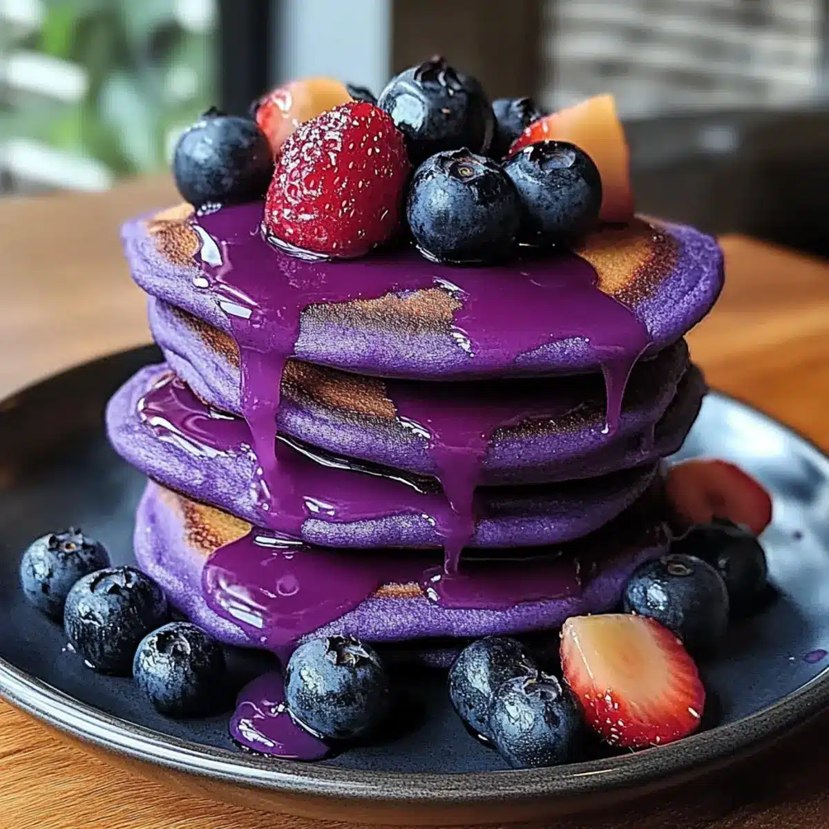 Farbe und Freude: Der lebendige lila Farbton macht diese Pfannkuchen zum Hingucker auf jedem Frühstückstisch und begeistert sowohl Augen als auch Gaumen.