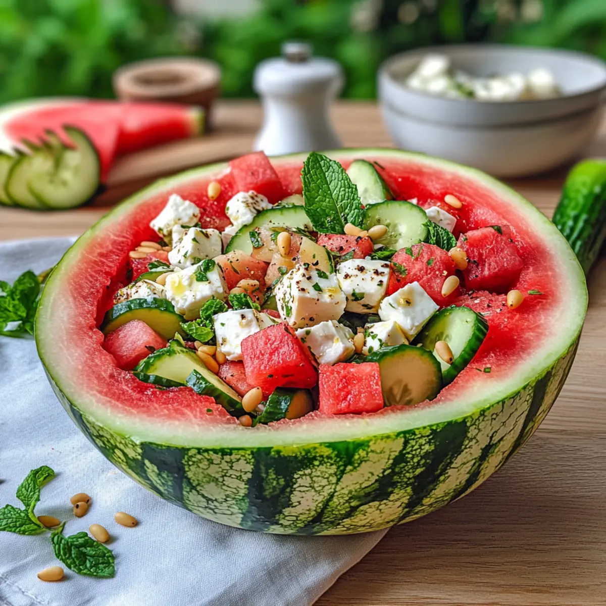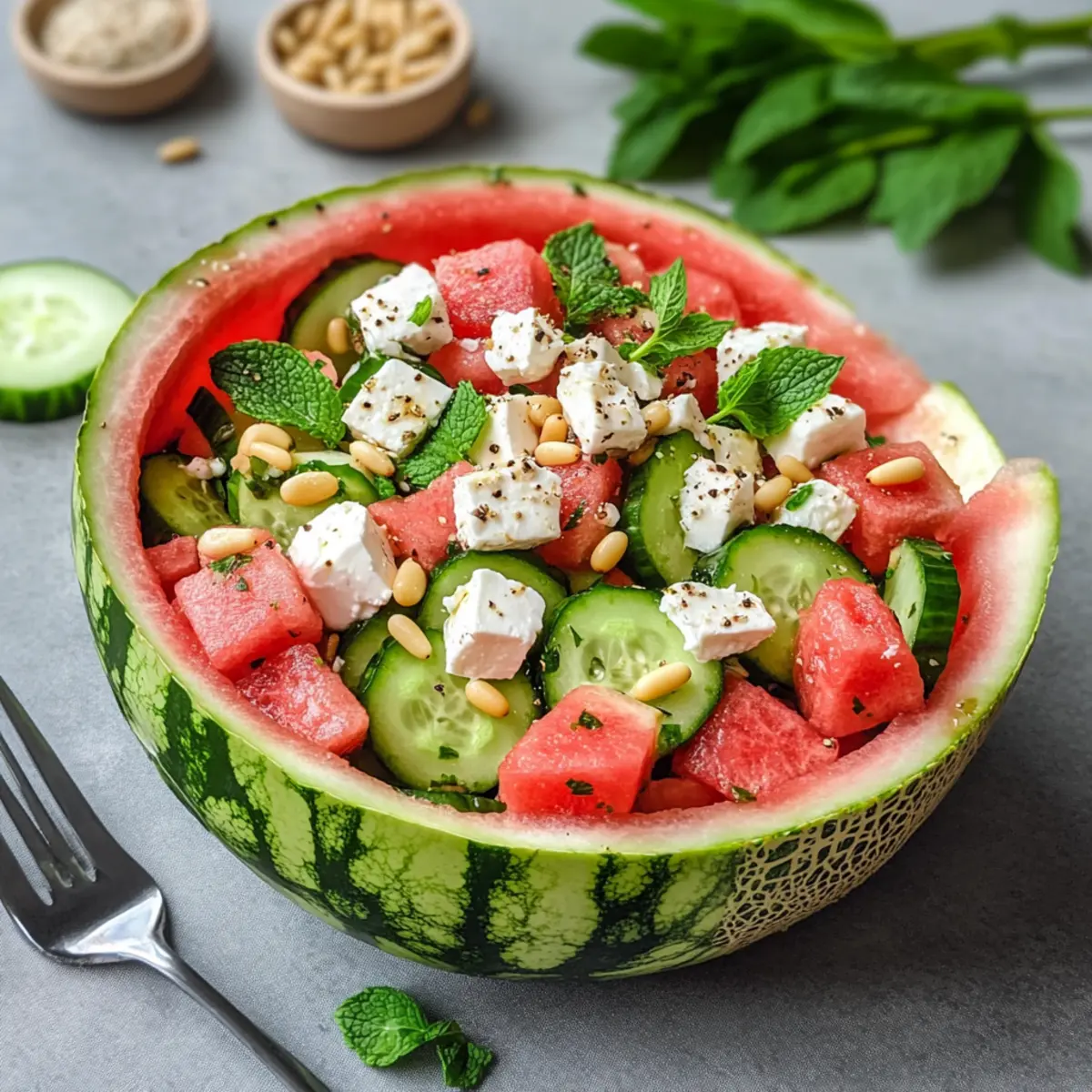 - Salat anrichten: Den gemischten Salat in die ausgehöhlte Wassermelone füllen.