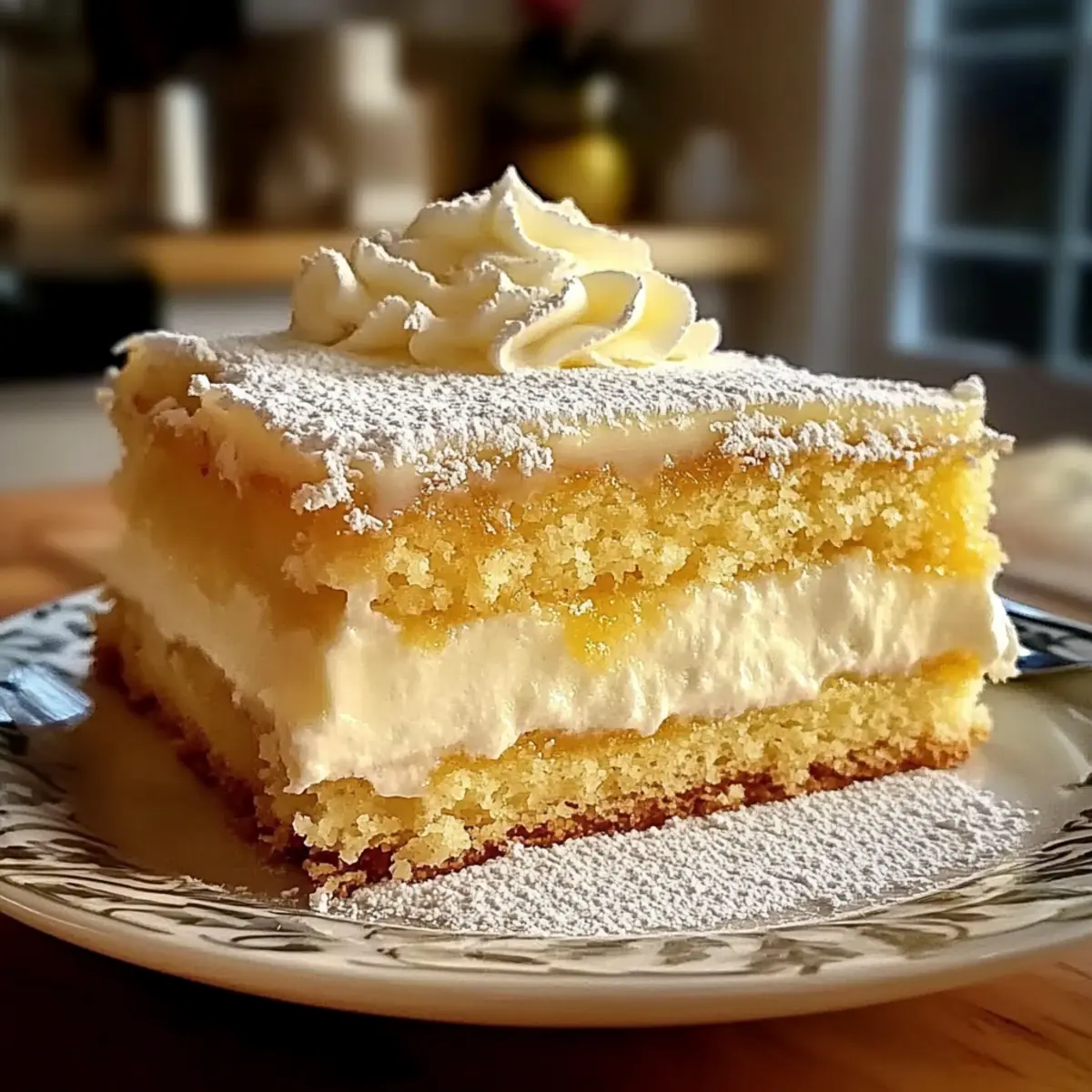 - Bestäuben Sie den gesamten Kuchen großzügig mit Puderzucker, bevor Sie ihn servieren.