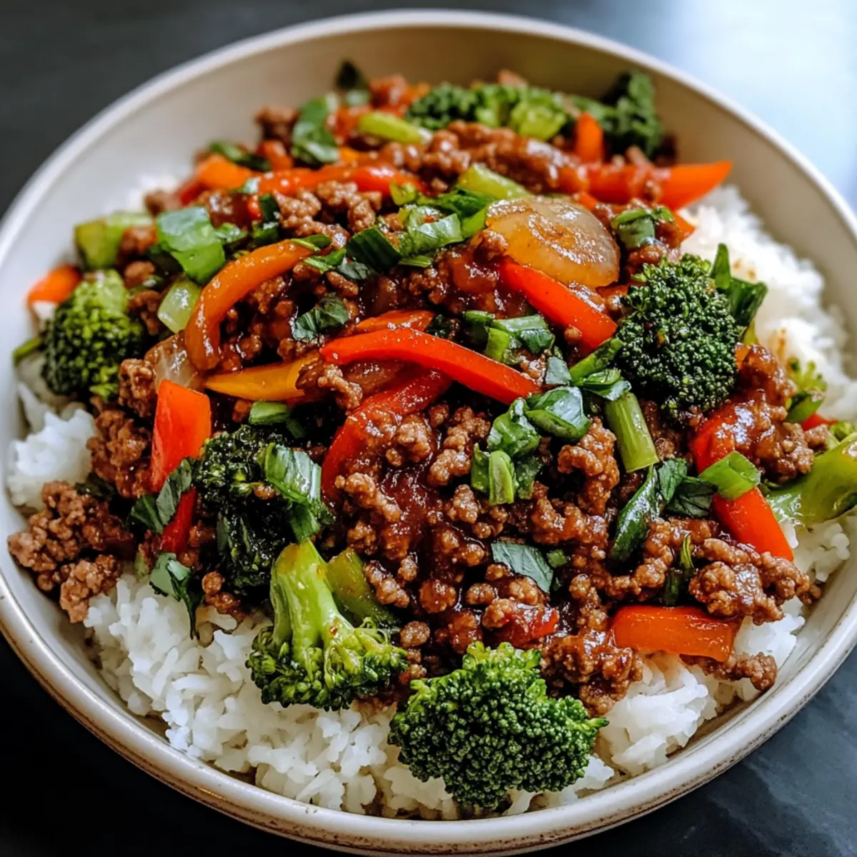 Verteile die würzige Rinderhackfleisch-Pfannengericht-Mischung gleichmäßig über den fluffigen Reis auf Tellern. Garniere das Gericht nach Belieben mit frischen, geschnittenen Frühlingszwiebeln für einen frischen Geschmackskontrast. Serviere das warme Pfannengericht sofort und genieße die köstliche Kombination aus Aromen und Texturen!