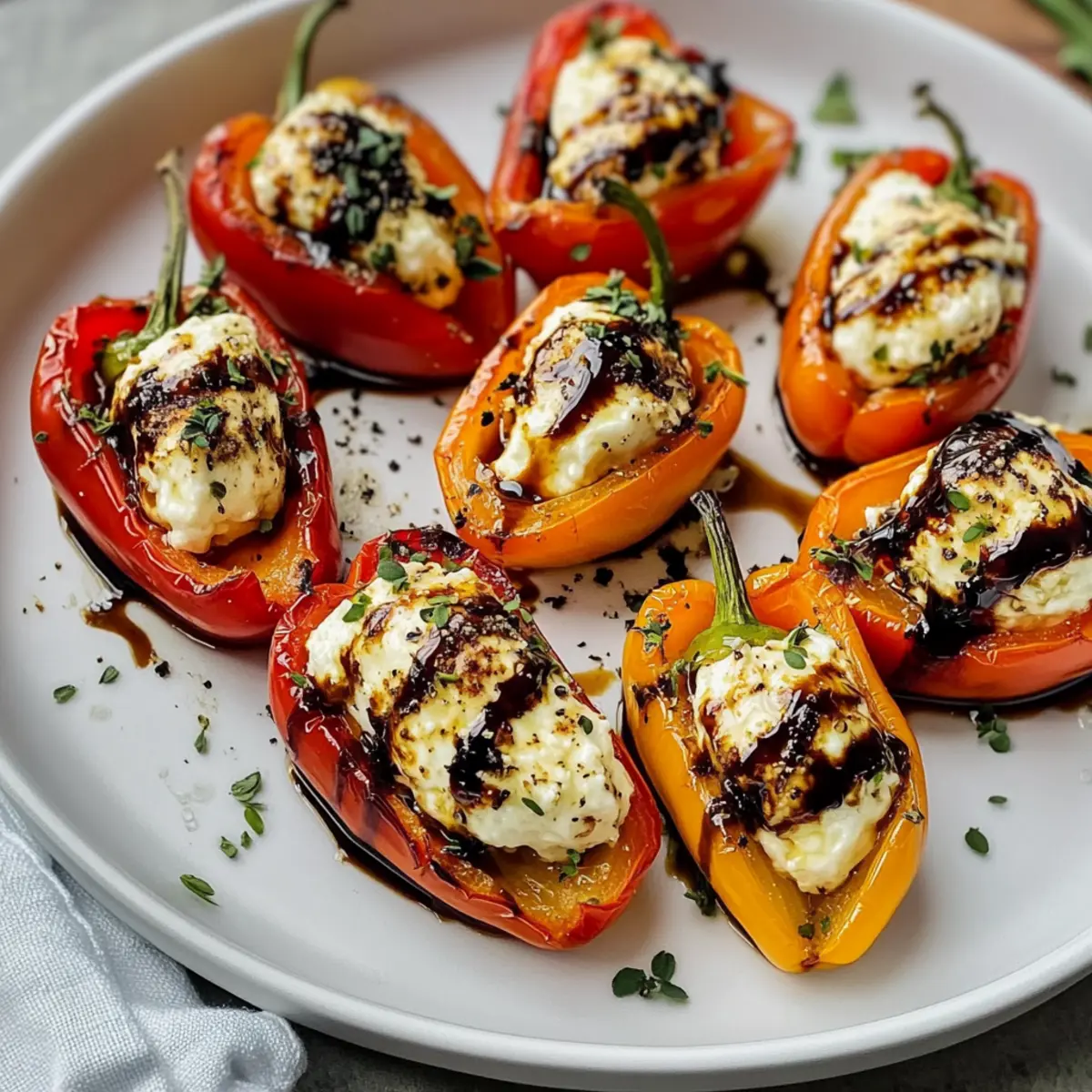 Nimm die Ziegenkäse gefüllten Mini-Paprika aus dem Ofen und lege sie auf eine Servierplatte. Träufele die Balsamico-Glasur und den Honig gleichmäßig über die heißen Paprika und bestreue sie anschließend mit frischen Thymianblättern und einer Prise schwarzem Pfeffer. Diese letzten Details verleihen dem Gericht eine geschmackliche Tiefe und machen es besonders ansprechend.